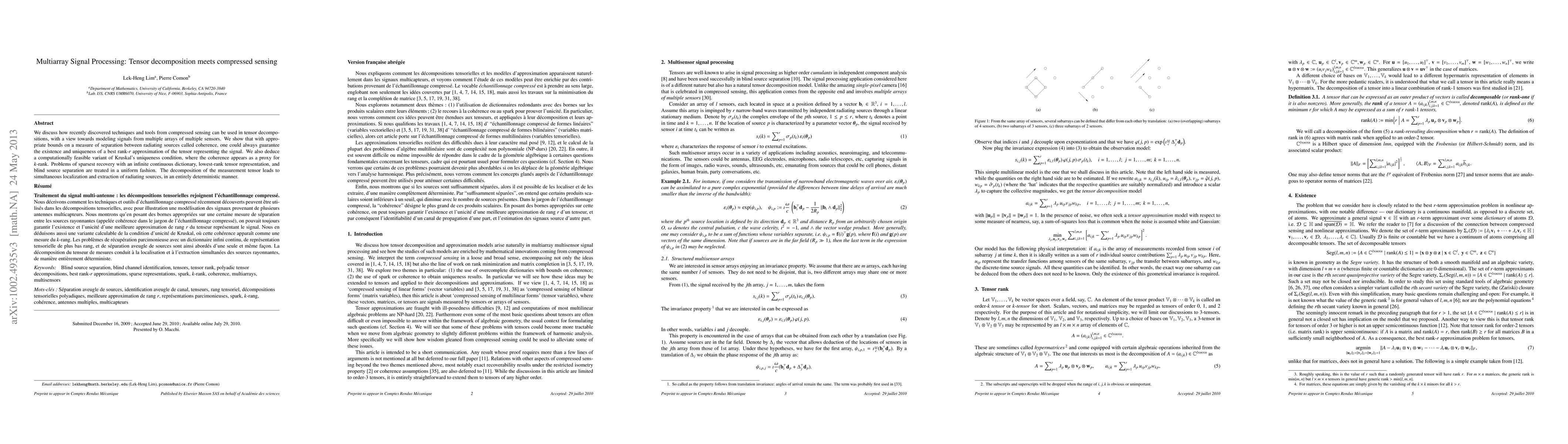 A recent study applies compressed sensing techniques to tensor decompositions to model signals from multiple arrays of sensors, guaranteeing the existence and uniqueness of a best rank-r approximation with certain bounds on source separation.