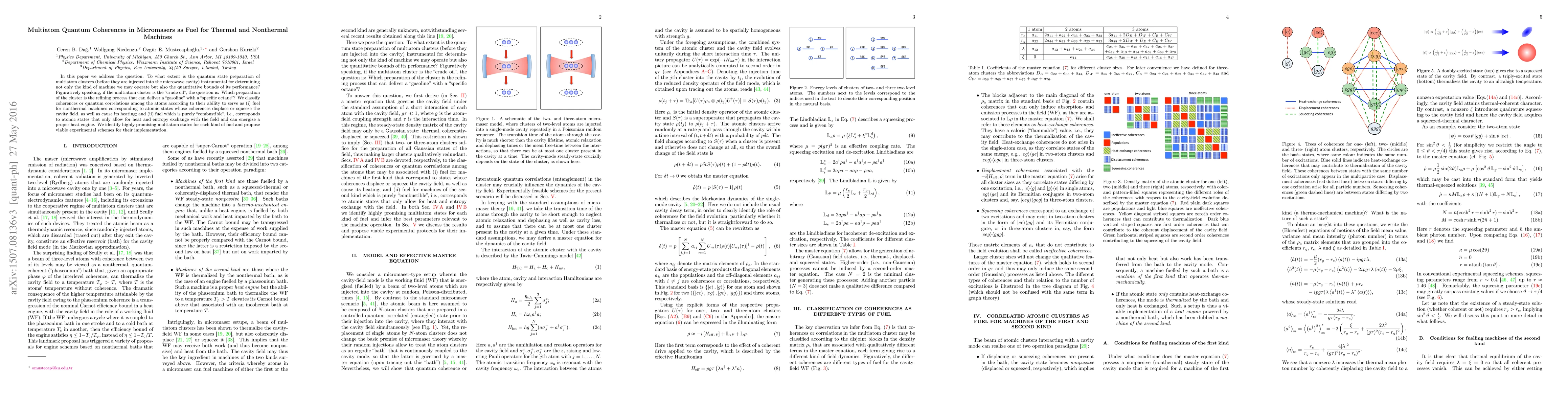 In this paper we address the question: To what extent is the quantum state preparation of multiatom clusters (before they are injected into the microwave cavity) instrumental for determining not only the kind of machine we may operate but also the quantitative bounds of its performance? Figuratively speaking, if the multiatom cluster is the "crude oil", the question is: Which preparation of the cluster is the refining process that can deliver a "gasoline" with a "specific octane"? We classify coherences or quantum correlations among the atoms according to their ability to serve as (i) fuel for nonthermal machines corresponding to atomic states whose coherences displace or squeeze the cavity field, as well as cause its heating; and (ii) fuel which is purely "combustible", i.e., corresponds to atomic states that only allow for heat and entropy exchange with the field and can energize a proper heat engine. We identify highly promising multiatom states for each kind of fuel and propose viable experimental schemes for their implementation.