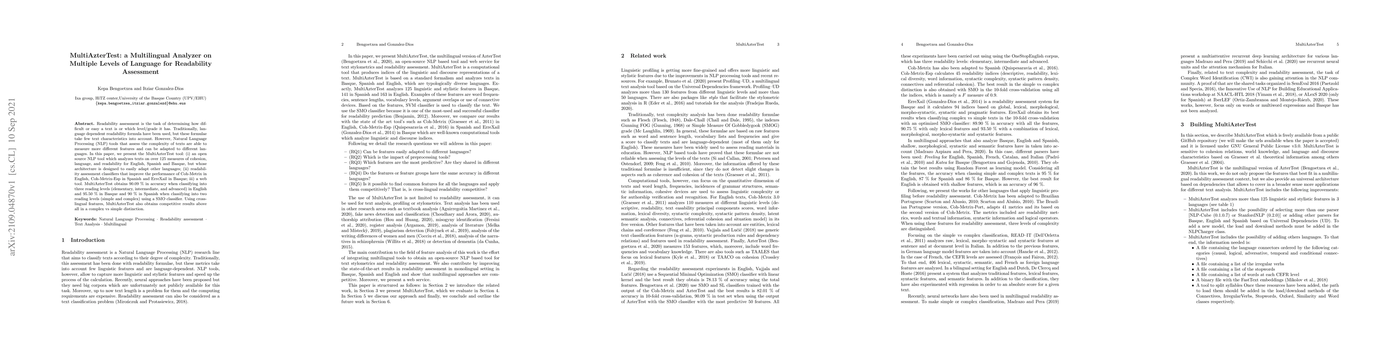 MultiAzterTest is an open-source NLP tool designed for multilingual readability assessment, analyzing texts on over 125 measures for English, Spanish, and Basque, and achieving high accuracy in classifying reading levels. It utilizes cross-lingual features for competitive results.