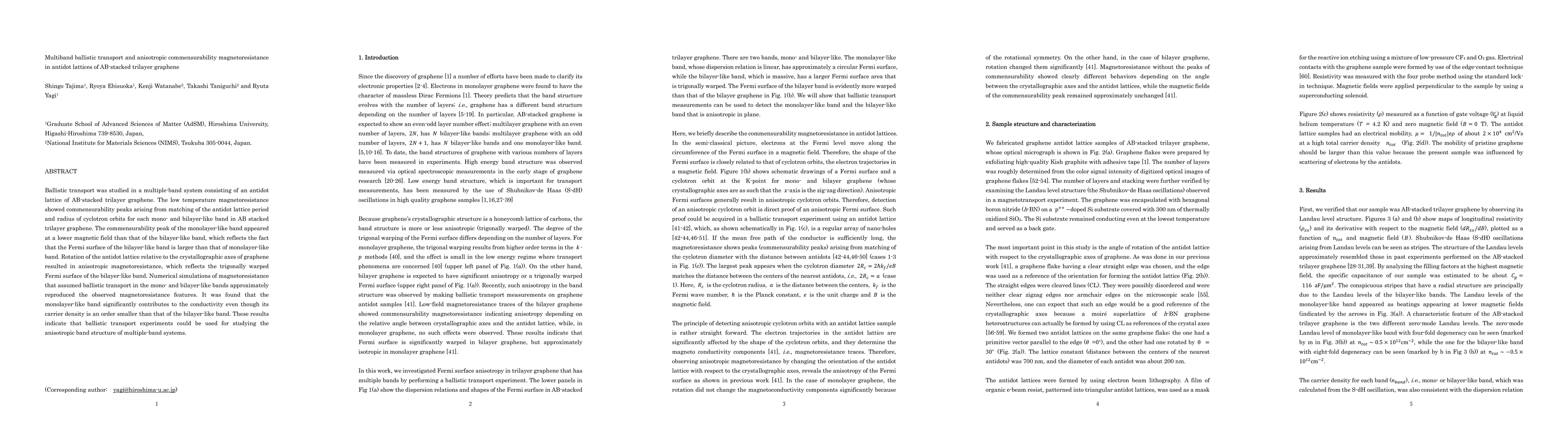 Ballistic transport was studied in a multiple-band system consisting of an antidot lattice of AB-stacked trilayer graphene. The low temperature magnetoresistance showed commensurability peaks arising from matching of the antidot lattice period and radius of cyclotron orbits for each mono- and bilayer-like band in AB stacked trilayer graphene. The commensurability peak of the monolayer-like band appeared at a lower magnetic field than that of the bilayer-like band, which reflects the fact that the Fermi surface of the bilayer-like band is larger than that of monolayer-like band. Rotation of the antidot lattice relative to the crystallographic axes of graphene resulted in anisotropic magnetoresistance, which reflects the trigonally warped Fermi surface of the bilayer-like band. Numerical simulations of magnetoresistance that assumed ballistic transport in the mono- and bilayer-like bands approximately reproduced the observed magnetoresistance features. It was found that the monolayer-like band significantly contributes to the conductivity even though its carrier density is an order smaller than that of the bilayer-like band. These results indicate that ballistic transport experiments could be used for studying the anisotropic band structure of multiple-band systems.