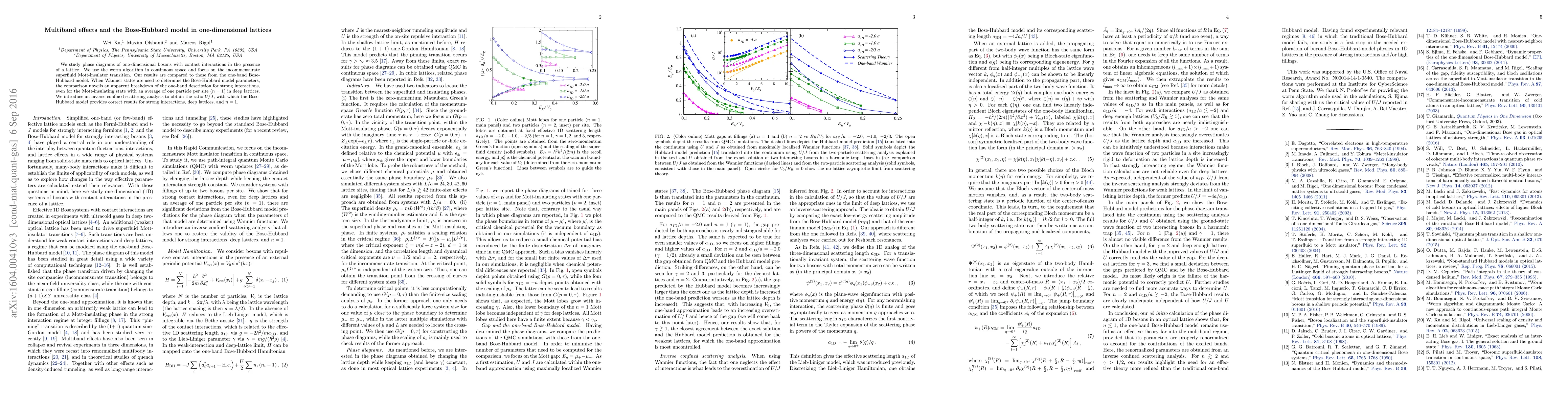 We study phase diagrams of one-dimensional bosons with contact interactions in the presence of a lattice. We use the worm algorithm in continuous space and focus on the incommensurate superfluid Mott-insulator transition. Our results are compared to those from the one-band Bose-Hubbard model. When Wannier states are used to determine the Bose-Hubbard model parameters, the comparison unveils an apparent breakdown of the one-band description for strong interactions, even for the Mott-insulating state with an average of one particle per site ($n=1$) in deep lattices. We introduce an inverse confined scattering analysis to obtain the ratio $U/J$, with which the Bose-Hubbard model provides correct results for strong interactions, deep lattices, and $n=1$.