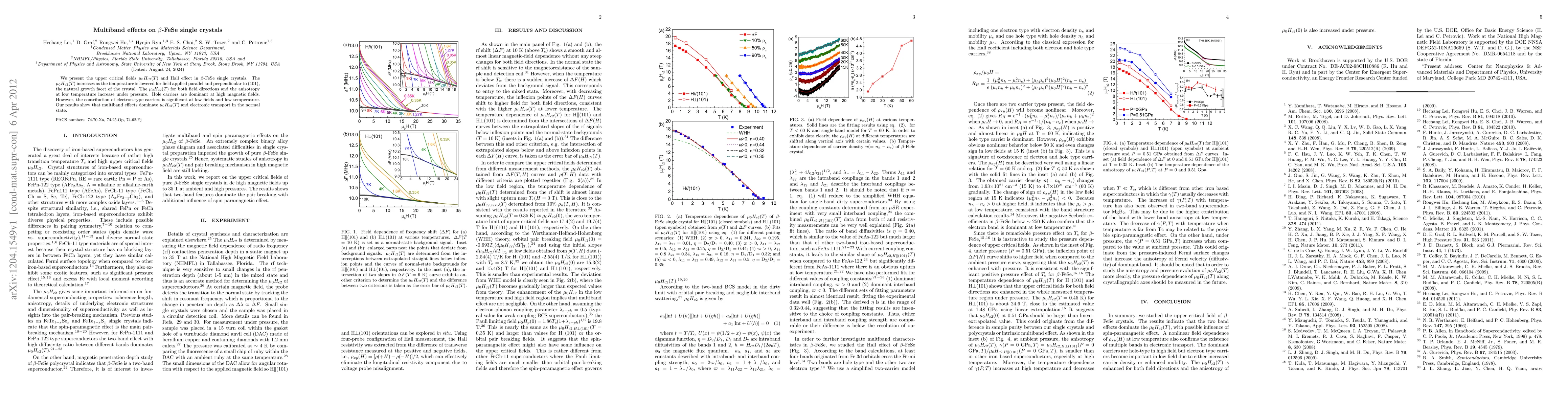 Researchers studied beta-FeSe single crystals, finding that multiband effects play a dominant role in determining upper critical fields and electronic transport at low temperatures. Pressure increases these values.