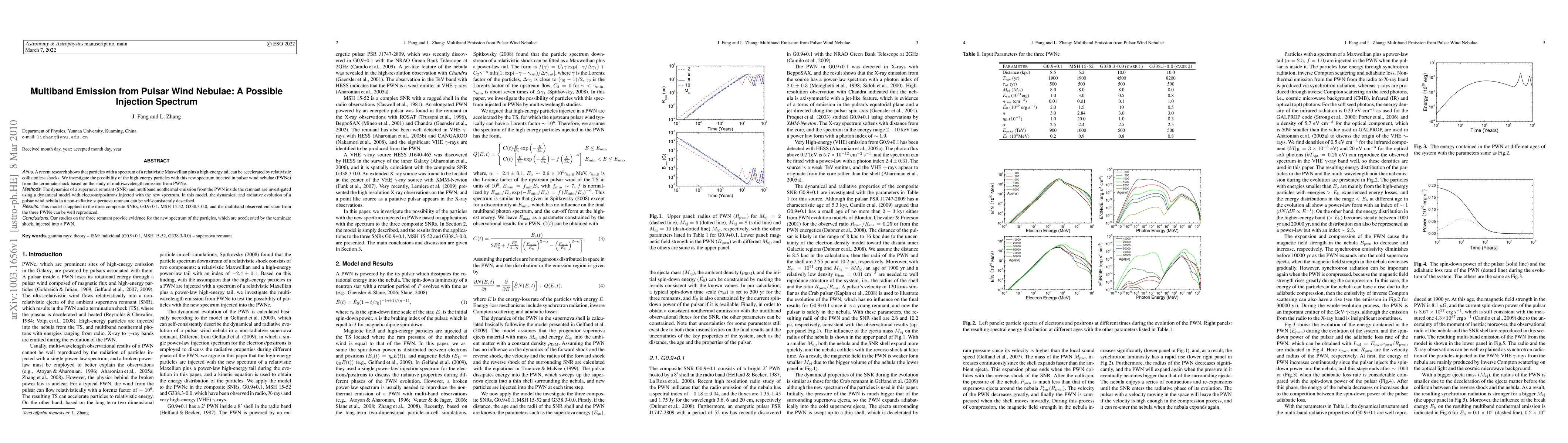 A recent research shows that particles with a spectrum of a relativistic Maxwellian plus a high-energy tail can be accelerated by relativistic collisionless shocks. We investigate the possibility of the high-energy particles with this new spectrum injected in pulsar wind nebulae (PWNe) from the terminate shock based on the study of multiwavelength emission from PWNe.} {The dynamics of a supernova remnant (SNR) and multiband nonthermal emission from the PWN inside the remnant are investigated using a dynamical model with electrons/positrons injected with the new spectrum. In this model, the dynamical and radiative evolution of a pulsar wind nebula in a non-radiative supernova remnant can be self-consistently described.} {This model is applied to the three composite SNRs, G0.9+0.1, MSH 15-52, G338.3-0.0, and the multiband observed emission from the three PWNe can be well reproduced.} {Our studies on the three remnant provide evidence for the new spectrum of the particles, which are accelerated by the terminate shock, injected into a PWN.
