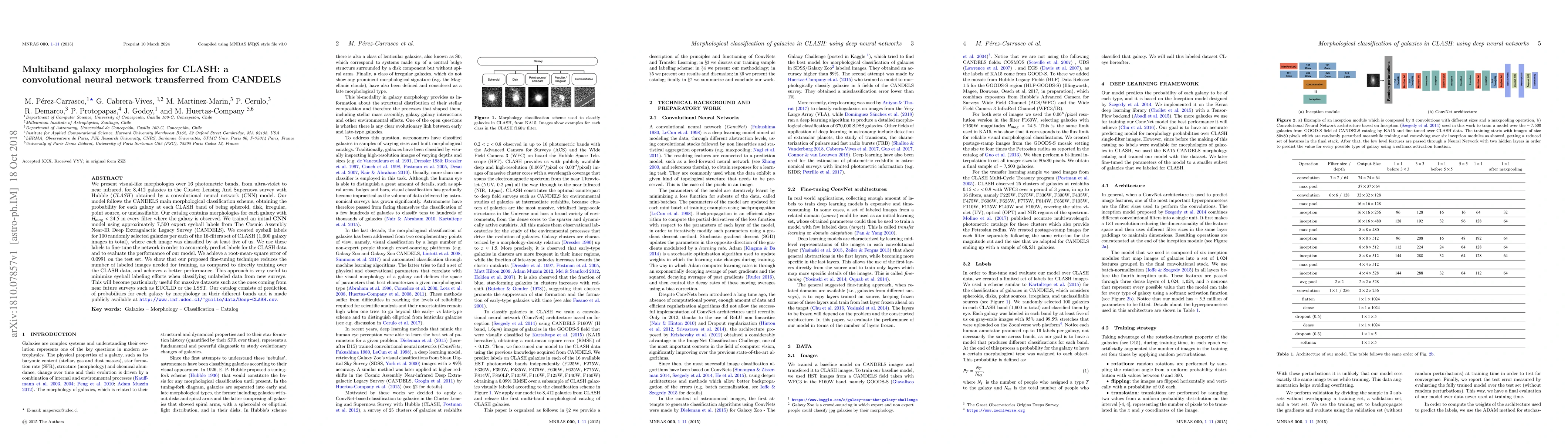 This paper presents a convolutional neural network (CNN) model trained to classify the morphologies of 8,412 galaxies in the CLASH survey across 16 photometric bands. The model, fine-tuned using expert eyeball labels from the CANDELS survey, achieves a root-mean-square error of 0.0991, demonstrating improved performance compared to direct training on CLASH data.