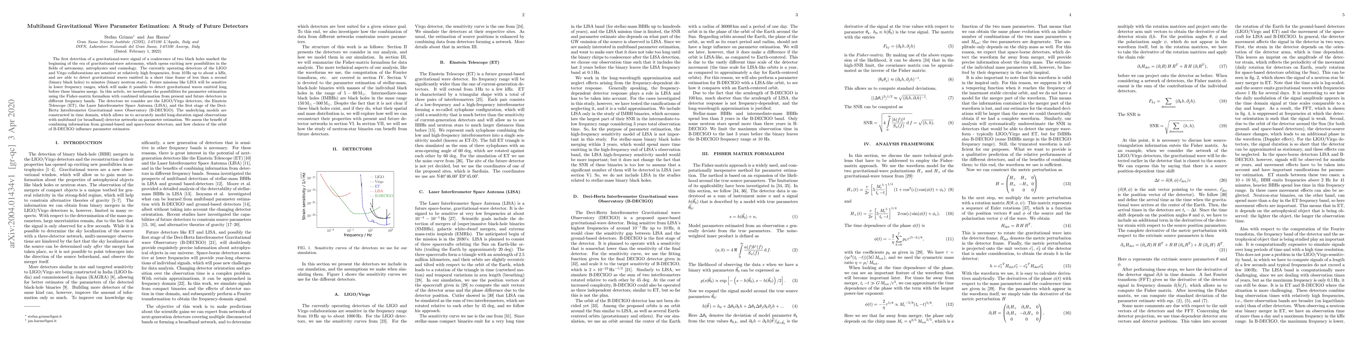 This paper explores the potential of parameter estimation for gravitational waves using the Fisher-matrix formalism, combining data from current and future detectors like LIGO/Virgo, ET, LISA, and B-DECIGO. It assesses the benefits of integrating information across different frequency bands and examines how the orbit of B-DECIGO affects parameter estimates.