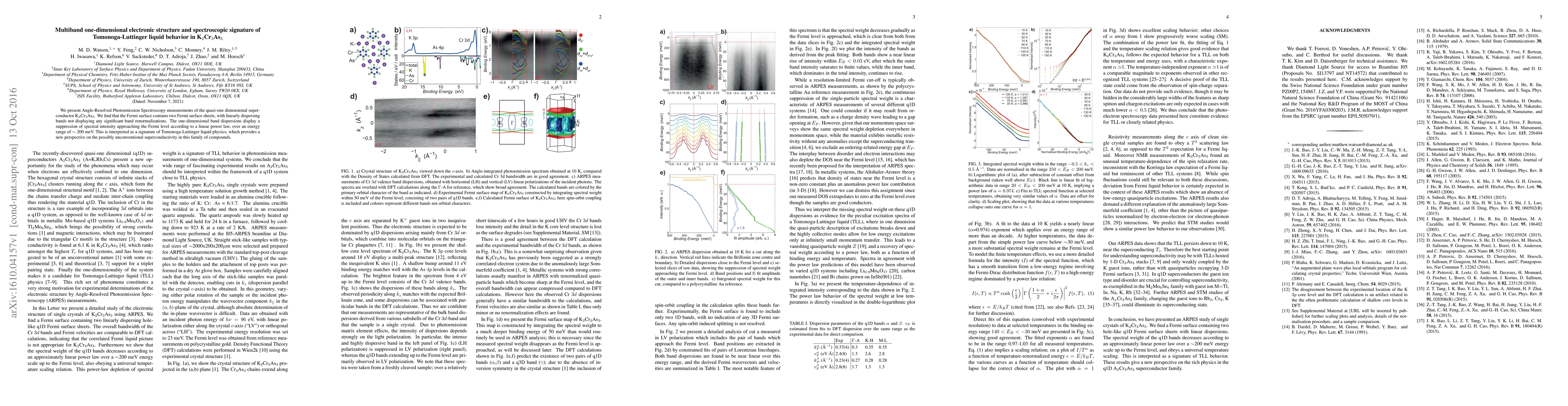This study uses Angle-Resolved Photoemission Spectroscopy to investigate K$_2$Cr$_3$As$_3$, revealing two Fermi surface sheets with linearly dispersing bands. The observed suppression of spectral intensity near the Fermi level follows a linear power law, indicating Tomonaga-Luttinger liquid behavior and suggesting unconventional superconductivity in this material.
