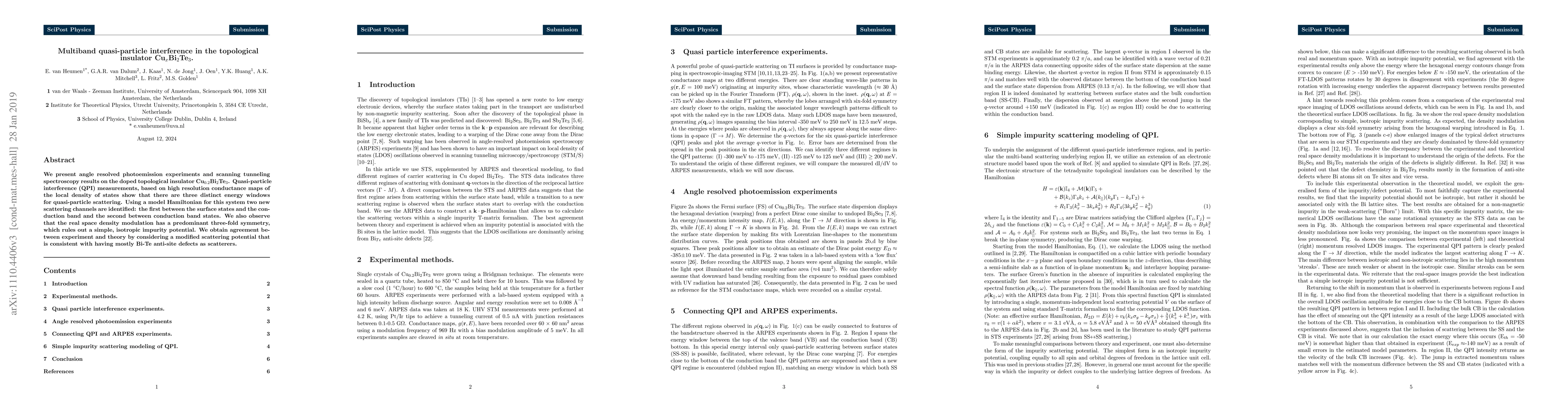 We present angle resolved photoemission experiments and scanning tunneling spectroscopy results on the doped topological insulator Cu0.2Bi2Te3. Quasi-particle interference (QPI) measurements, based on high resolution conductance maps of the local density of states show that there are three distinct energy windows for quasi-particle scattering. Using a model Hamiltonian for this system two new scattering channels are identified: the first between the surface states and the conduction band and the second between conduction band states. We also observe that the real space density modulation has a predominant three-fold symmetry, which rules out a simple, isotropic impurity potential. We obtain agreement between experiment and theory by considering a modified scattering potential that is consistent with having mostly Bi-Te anti-site defects as scatterers.