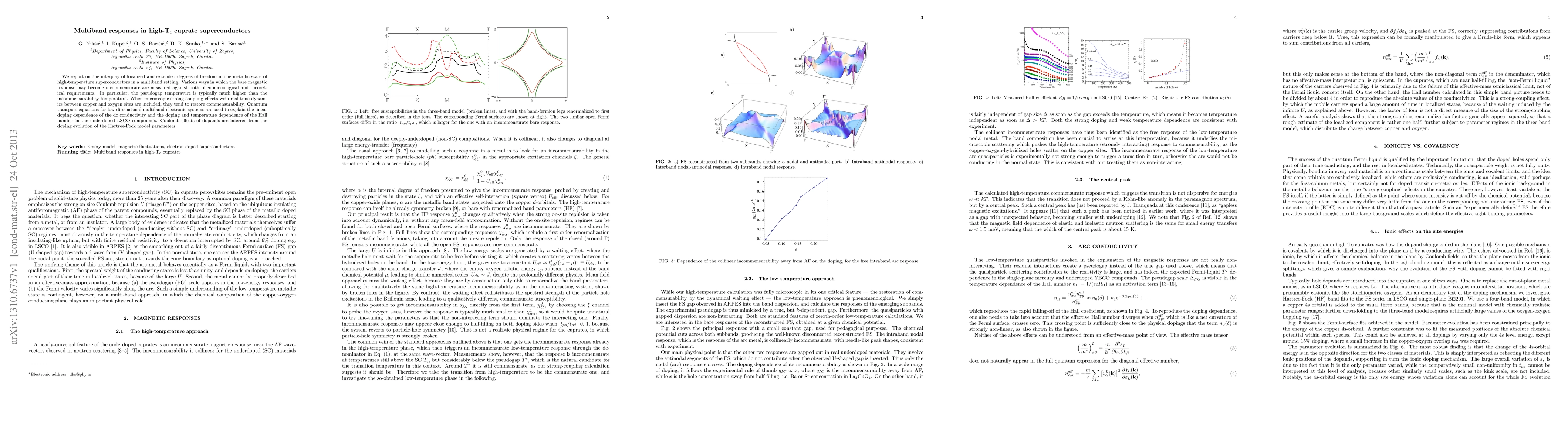 We report on the interplay of localized and extended degrees of freedom in the metallic state of high-temperature superconductors in a multiband setting. Various ways in which the bare magnetic response may become incommensurate are measured against both phenomenological and theoretical requirements. In particular, the pseudogap temperature is typically much higher than the incommensurability temperature. When microscopic strong-coupling effects with real-time dynamics between copper and oxygen sites are included, they tend to restore commensurability. Quantum transport equations for low-dimensional multiband electronic systems are used to explain the linear doping dependence of the dc conductivity and the doping and temperature dependence of the Hall number in the underdoped LSCO compounds. Coulomb effects of dopands are inferred from the doping evolution of the Hartree-Fock model parameters.