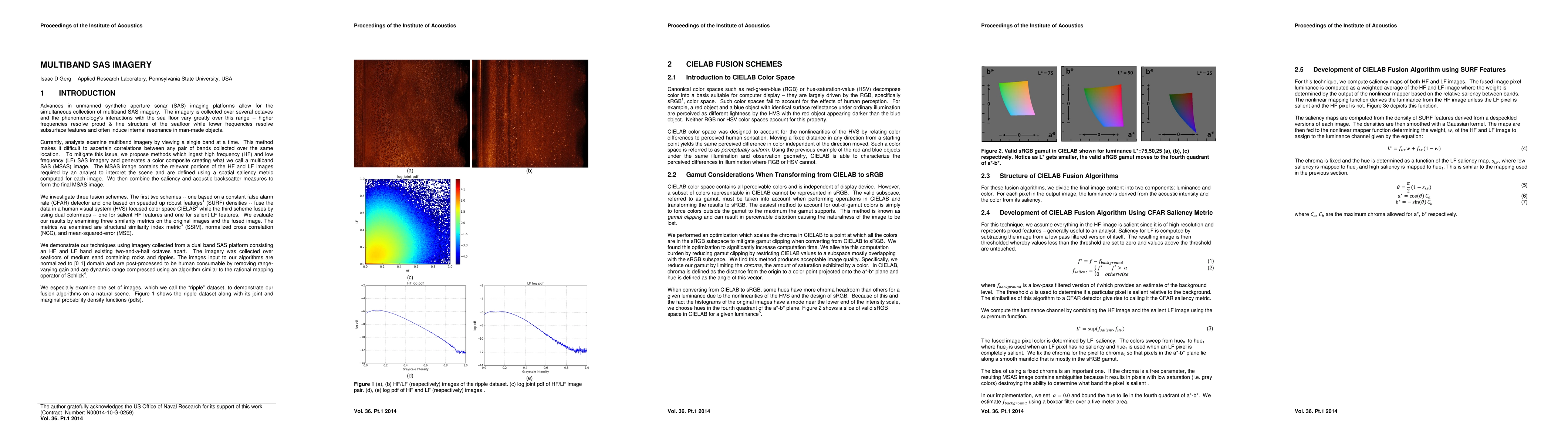 Advances in unmanned synthetic aperture sonar (SAS) imaging platforms allow for the simultaneous collection of multiband SAS imagery. The imagery is collected over several octaves and the phenomenology's interactions with the sea floor vary greatly over this range -- higher frequencies resolve proud and fine structure of the seafloor while lower frequencies resolve subsurface features and often induce internal resonance in man-made objects. Currently, analysts examine multiband imagery by viewing a single band at a time. This method makes it difficult to ascertain correlations between any pair of bands collected over the same location. To mitigate this issue, we propose methods which ingest high frequency (HF) and low frequency (LF) SAS imagery and generates a color composite creating what we call a multiband SAS (MSAS) image. The MSAS image contains the relevant portions of the HF and LF images required by an analyst to interpret the scene and are defined using a spatial saliency metric computed for each image. We then combine the saliency and acoustic backscatter measures to form the final MSAS image.