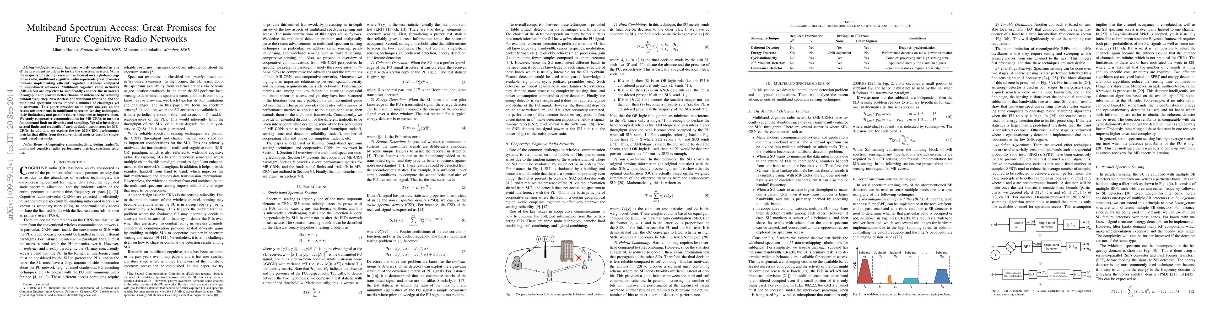 This paper explores the potential of multiband cognitive radio networks (MB-CRNs) to enhance throughput and reduce handoff frequency compared to single-band networks. It analyzes recent advancements in multiband spectrum sensing, discusses challenges, and investigates cooperative communications and performance metrics for MB-CRNs.