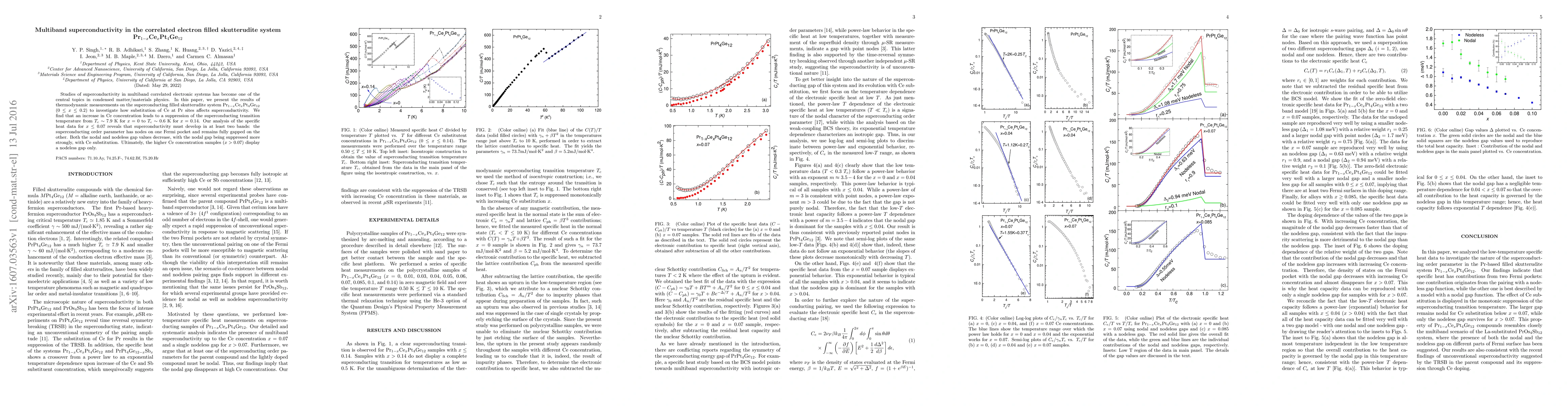 The paper presents a detailed analysis of specific heat measurements to discern multiband superconductivity with nodal and nodeless gaps in the Pr1-xCe_xPt4Ge12 system, providing a comprehensive understanding of the effect of Ce substitution on superconductivity in filled skutterudites.