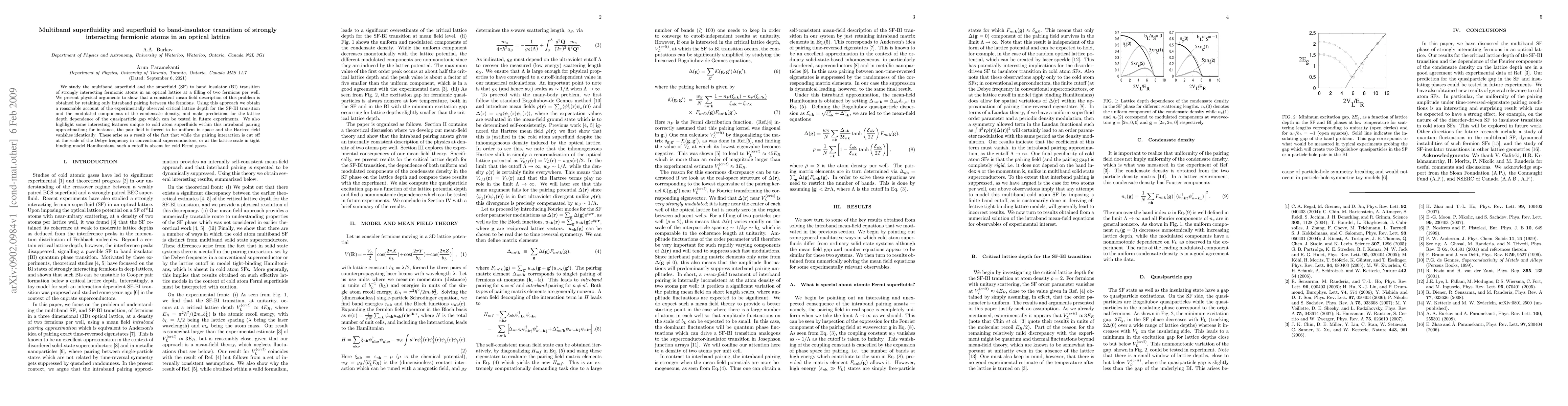 We study the multiband superfluid and the superfluid (SF) to band insulator (BI) transition of strongly interacting fermionic atoms in an optical lattice at a filling of two fermions per well. We present physical arguments to show that a consistent mean field description of this problem is obtained by retaining only intraband pairing between the fermions. Using this approach we obtain a reasonable account of the experimentally observed critical lattice depth for the SF-BI transition and the modulated components of the condensate density, and make predictions for the lattice depth dependence of the quasiparticle gap which can be tested in future experiments. We also highlight some interesting features unique to cold atom superfluids within this intraband pairing approximation; for instance, the pair field is forced to be uniform in space and the Hartree field vanishes identically. These arise as a result of the fact that while the pairing interaction is cut off at the scale of the Debye frequency in conventional superconductors, or at the lattice scale in tight binding model Hamiltonians, such a cutoff is absent for cold Fermi gases.