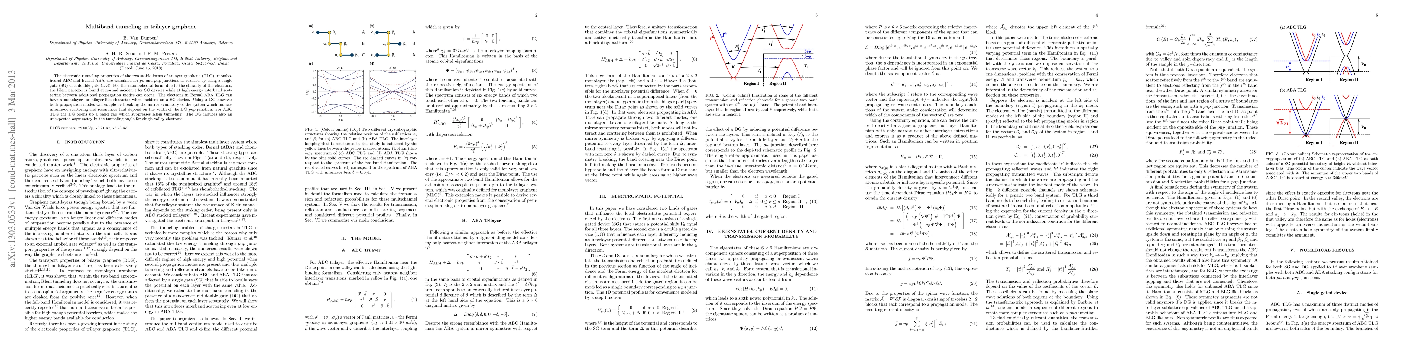 This paper investigates electronic tunneling in rhombohedral ABC and Bernal ABA trilayer graphene for pn and pnp junctions, revealing that the Klein paradox occurs in ABC TLG under a single gate while interband scattering affects high-energy states. A double gate induces intermode scattering and resonances in Bernal ABA TLG, opening a band gap in ABC TLG and causing an asymmetry in tunneling angles.