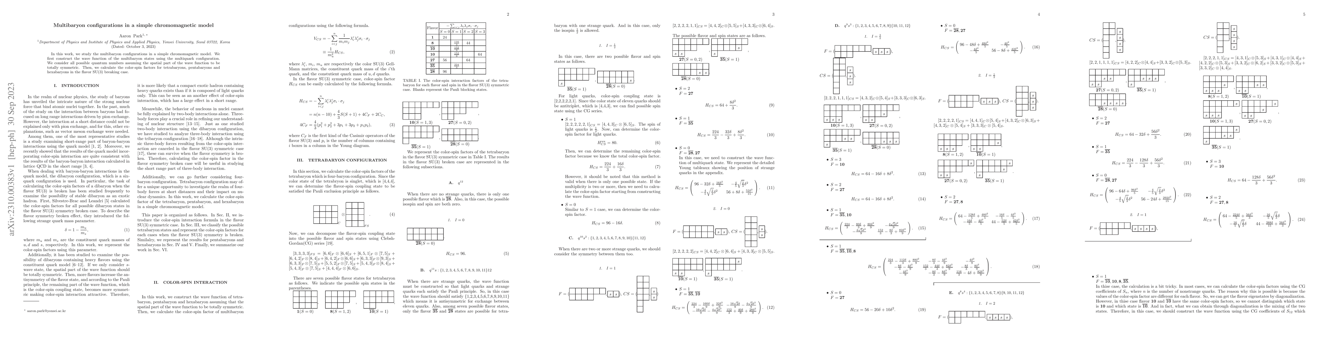 This paper investigates multibaryon configurations within a chromomagnetic model, constructing wave functions for multibaryon states using multiquark configurations and calculating color-spin factors for tetrabaryons, pentabaryons, and hexabaryons, considering flavor SU(3) breaking.
