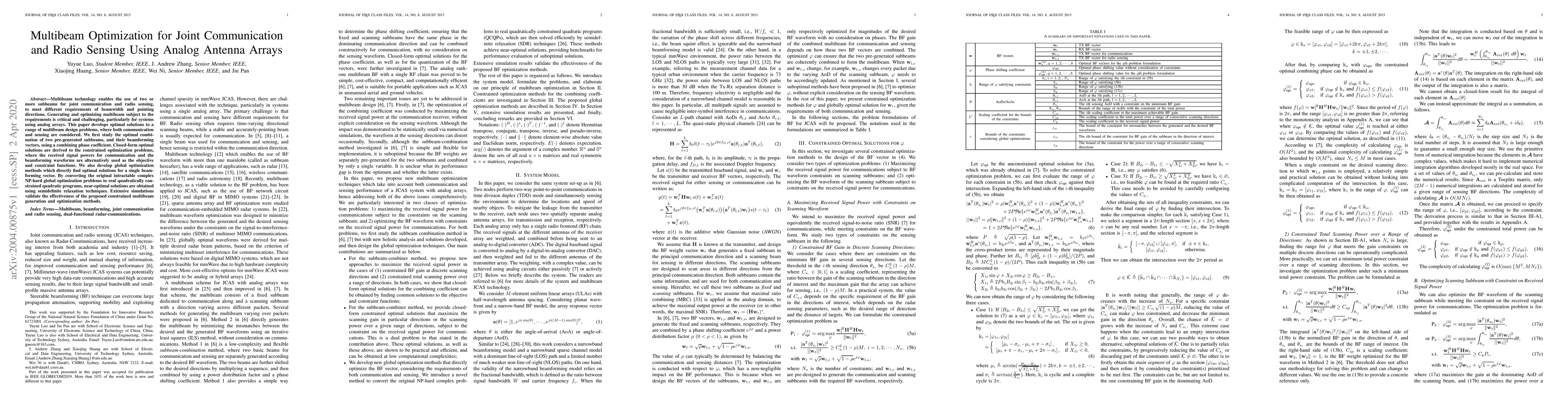 This paper develops optimal solutions for multibeam optimization in analog antenna arrays to jointly enhance communication and radio sensing. It presents closed-form and global optimization methods for combining subbeams and deriving optimal beamforming vectors, validated through extensive simulations.