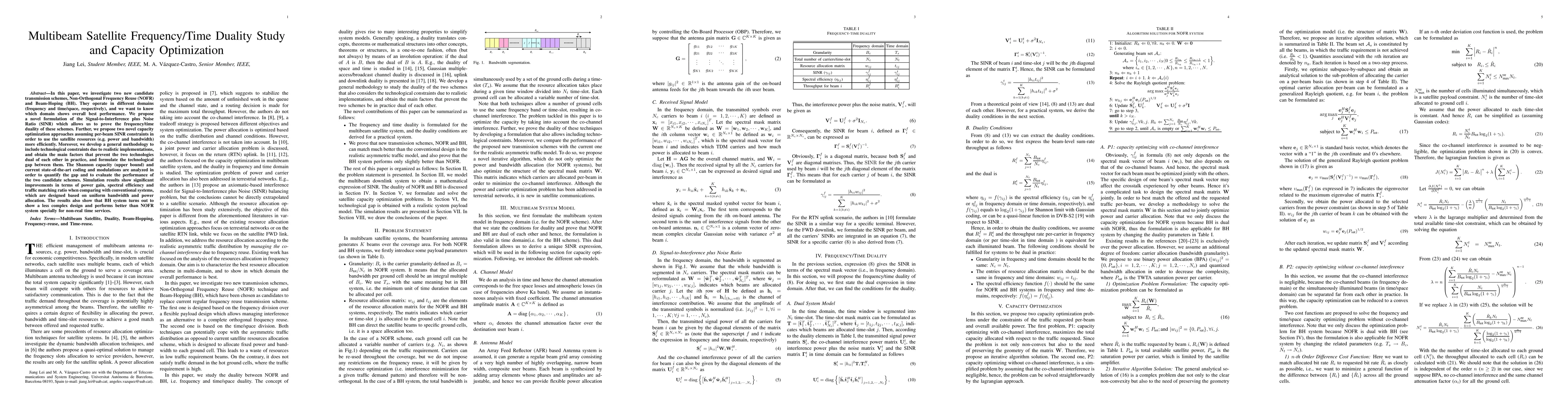 In this paper, we investigate two new candidate transmission schemes, Non-Orthogonal Frequency Reuse (NOFR) and Beam-Hoping (BH). They operate in different domains (frequency and time/space, respectively), and we want to know which domain shows overall best performance. We propose a novel formulation of the Signal-to-Interference plus Noise Ratio (SINR) which allows us to prove the frequency/time duality of these schemes. Further, we propose two novel capacity optimization approaches assuming per-beam SINR constraints in order to use the satellite resources (e.g. power and bandwidth) more efficiently. Moreover, we develop a general methodology to include technological constraints due to realistic implementations, and obtain the main factors that prevent the two technologies dual of each other in practice, and formulate the technological gap between them. The Shannon capacity (upper bound) and current state-of-the-art coding and modulations are analyzed in order to quantify the gap and to evaluate the performance of the two candidate schemes. Simulation results show significant improvements in terms of power gain, spectral efficiency and traffic matching ratio when comparing with conventional systems, which are designed based on uniform bandwidth and power allocation. The results also show that BH system turns out to show a less complex design and performs better than NOFR system specially for non-real time services.