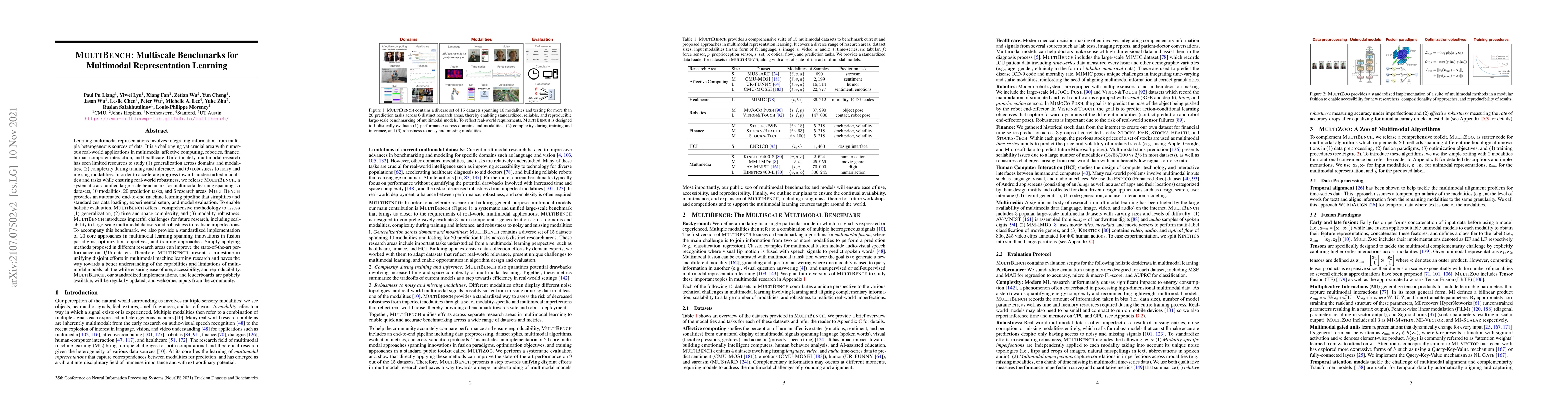 MultiBench is a comprehensive benchmark for multimodal representation learning, offering 15 datasets across 10 modalities and 20 tasks to evaluate generalization, complexity, and robustness. It aims to unify multimodal research efforts and improve model performance through standardized implementation and evaluation.