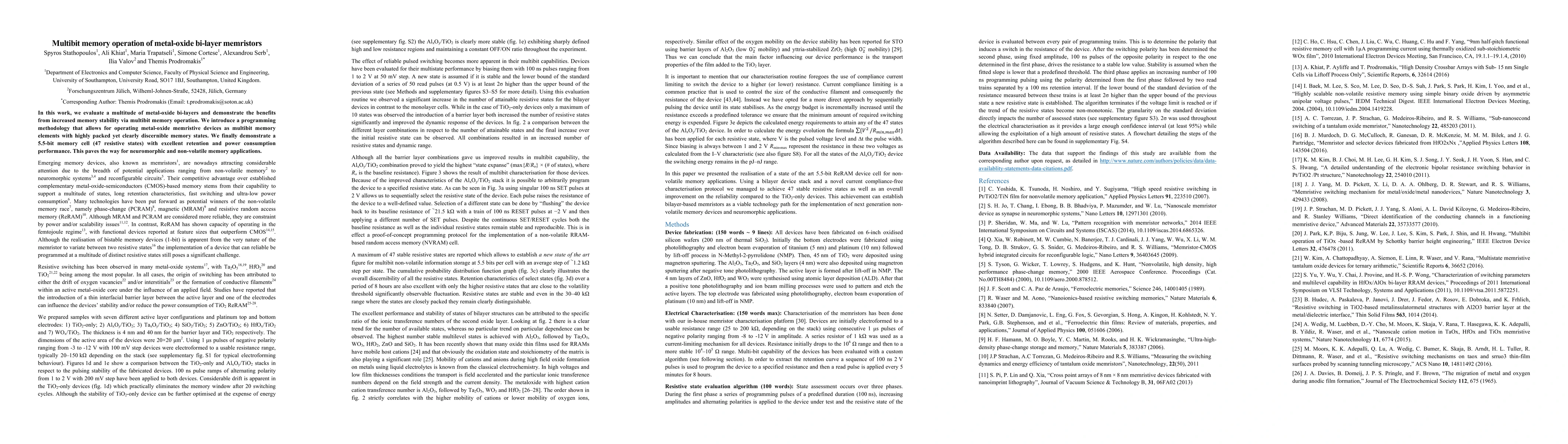 In this work, we evaluate a multitude of metal-oxide bi-layers and demonstrate the benefits from increased memory stability via multibit memory operation. We introduce a programming methodology that allows for operating metal-oxide memristive devices as multibit memory elements with highly packed yet clearly discernible memory states. We finally demonstrate a 5.5-bit memory cell (47 resistive states) with excellent retention and power consumption performance. This paves the way for neuromorphic and non-volatile memory applications.