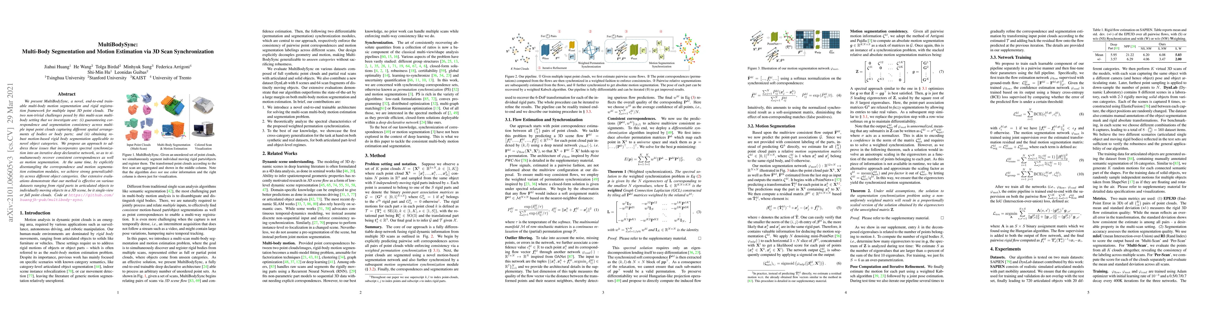 MultiBodySync is an end-to-end trainable framework for multi-body motion segmentation and registration using synchronized 3D scans. It addresses correspondence consistency and robust segmentation across different spatial arrangements and object categories through spectral synchronization and an iterative deep network.