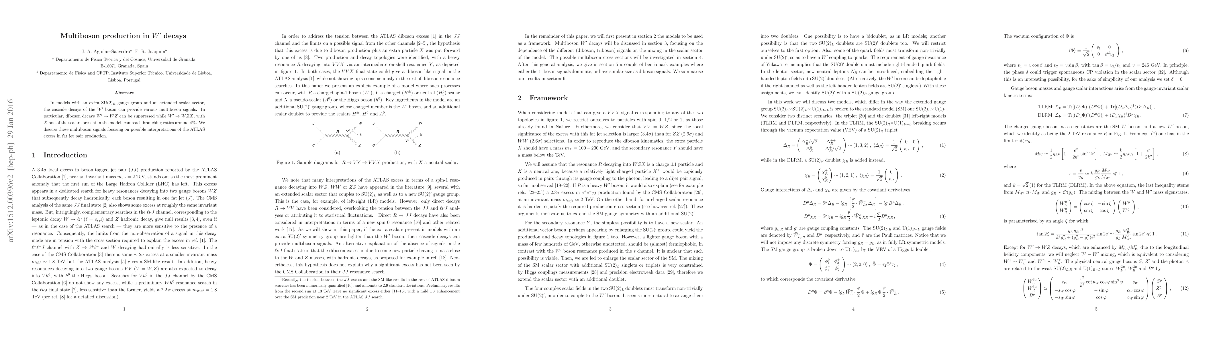 This paper explores multiboson production in $W'$ decays within models featuring an extra $\text{SU}(2)_R$ gauge group and an extended scalar sector, highlighting that while $W' \to WZ$ decays may be suppressed, $W' \to WZX$ decays can achieve significant branching ratios, potentially explaining the ATLAS excess in fat jet pair production.