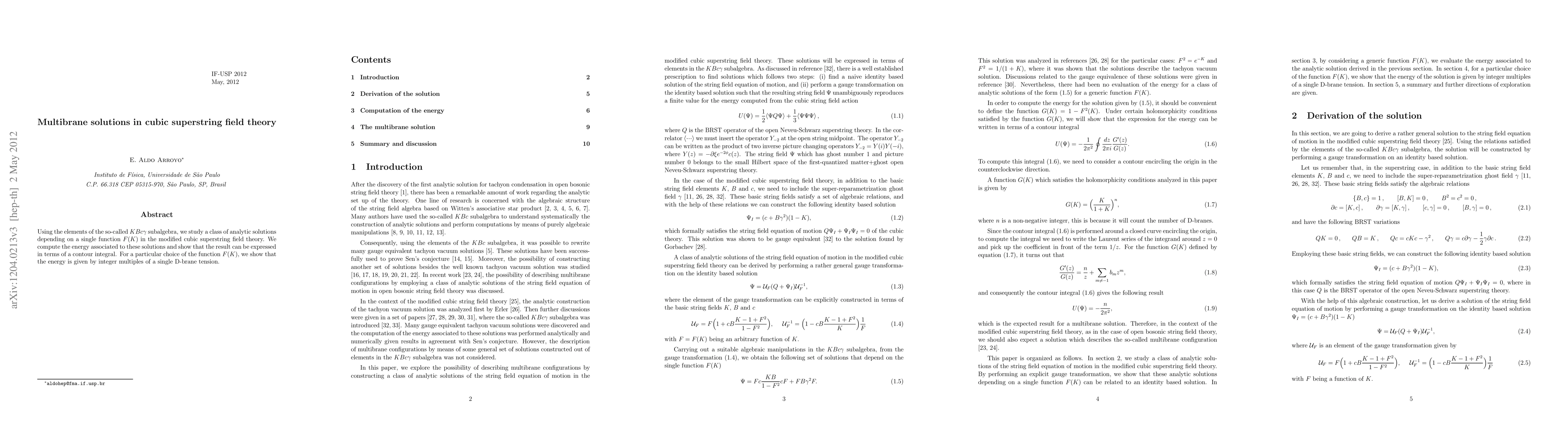 Summary: The paper explores analytic solutions in modified cubic superstring field theory based on the $KBc\gamma$ subalgebra, computing their energy expressed via a contour integral, which for specific function choices, correlates with integer multiples of D-brane tension.