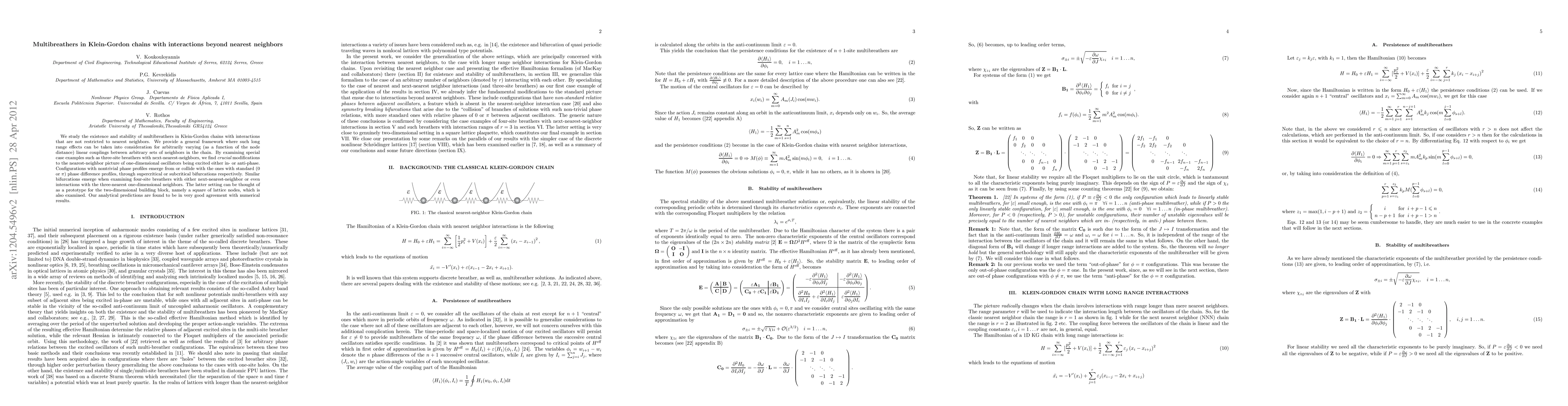 This paper investigates multibreathers in Klein-Gordon chains with extended interactions beyond nearest neighbors, providing a framework for long-range effects and linear couplings. It reveals significant modifications to the standard nearest-neighbor oscillator behavior, including nontrivial phase profiles and spontaneous symmetry breaking bifurcations in multi-site breathers.
