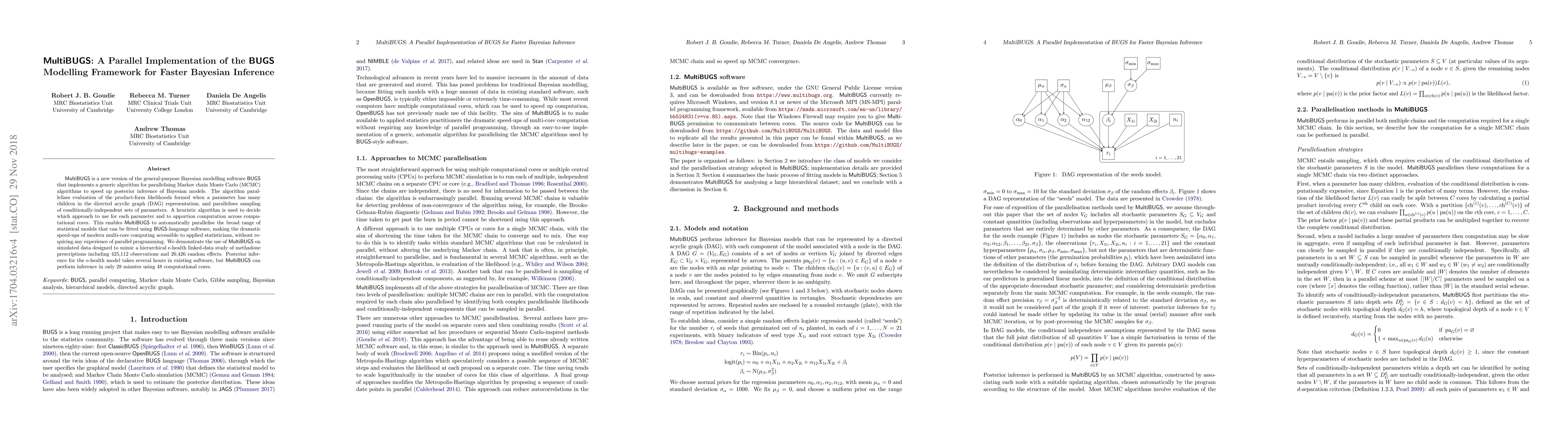 MultiBUGS (https://www.multibugs.org) is a new version of the general-purpose Bayesian modelling software BUGS that implements a generic algorithm for parallelising Markov chain Monte Carlo (MCMC) algorithms to speed up posterior inference of Bayesian models. The algorithm parallelises evaluation of the product-form likelihoods formed when a parameter has many children in the directed acyclic graph (DAG) representation; and parallelises sampling of conditionally-independent sets of parameters. A heuristic algorithm is used to decide which approach to use for each parameter and to apportion computation across computational cores. This enables MultiBUGS to automatically parallelise the broad range of statistical models that can be fitted using BUGS-language software, making the dramatic speed-ups of modern multi-core computing accessible to applied statisticians, without requiring any experience of parallel programming. We demonstrate the use of MultiBUGS on simulated data designed to mimic a hierarchical e-health linked-data study of methadone prescriptions including 425,112 observations and 20,426 random effects. Posterior inference for the e-health model takes several hours in existing software, but MultiBUGS can perform inference in only 28 minutes using 48 computational cores.