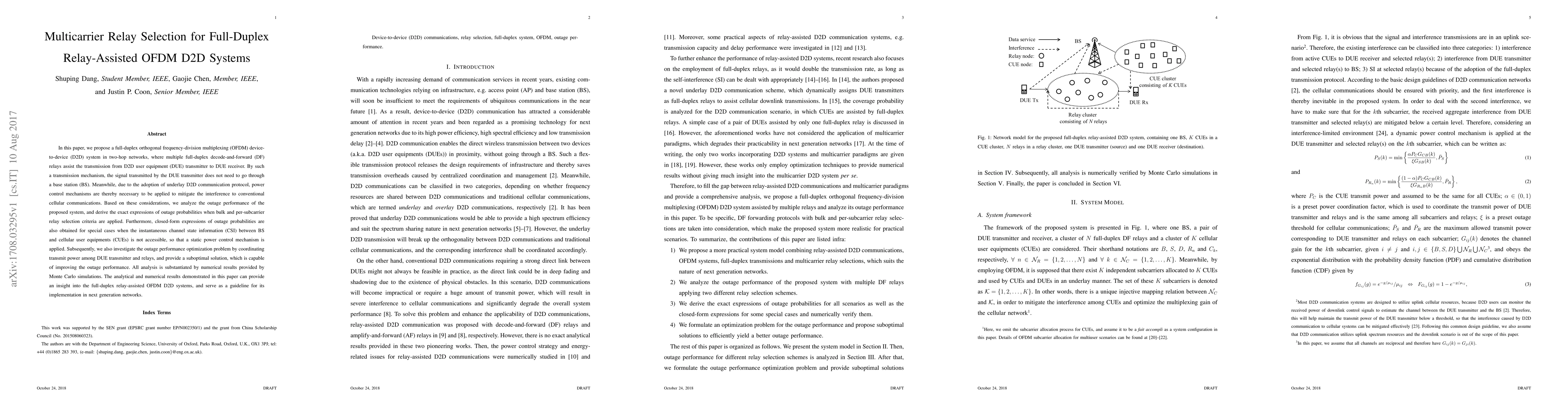 This paper proposes a full-duplex OFDM D2D system with multiple relays, analyzing its outage performance under various relay selection criteria and power control mechanisms. It provides exact and closed-form expressions for outage probabilities and a suboptimal solution for power optimization, validated by Monte Carlo simulations.