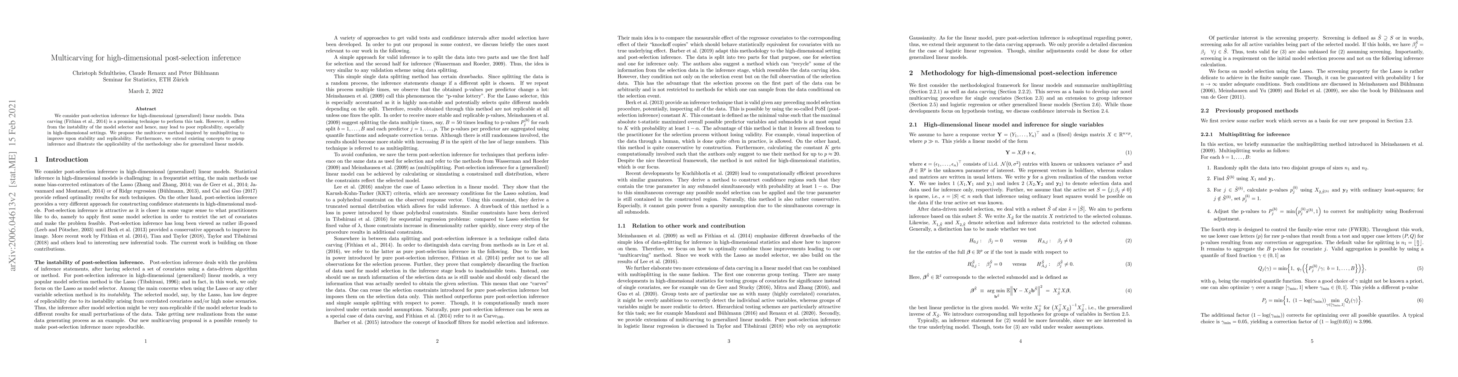 We consider post-selection inference for high-dimensional (generalized) linear models. Data carving (Fithian et al., 2014) is a promising technique to perform this task. However, it suffers from the instability of the model selector and hence, may lead to poor replicability, especially in high-dimensional settings. We propose the multicarve method inspired by multisplitting to improve upon stability and replicability. Furthermore, we extend existing concepts to group inference and illustrate the applicability of the methodology also for generalized linear models.