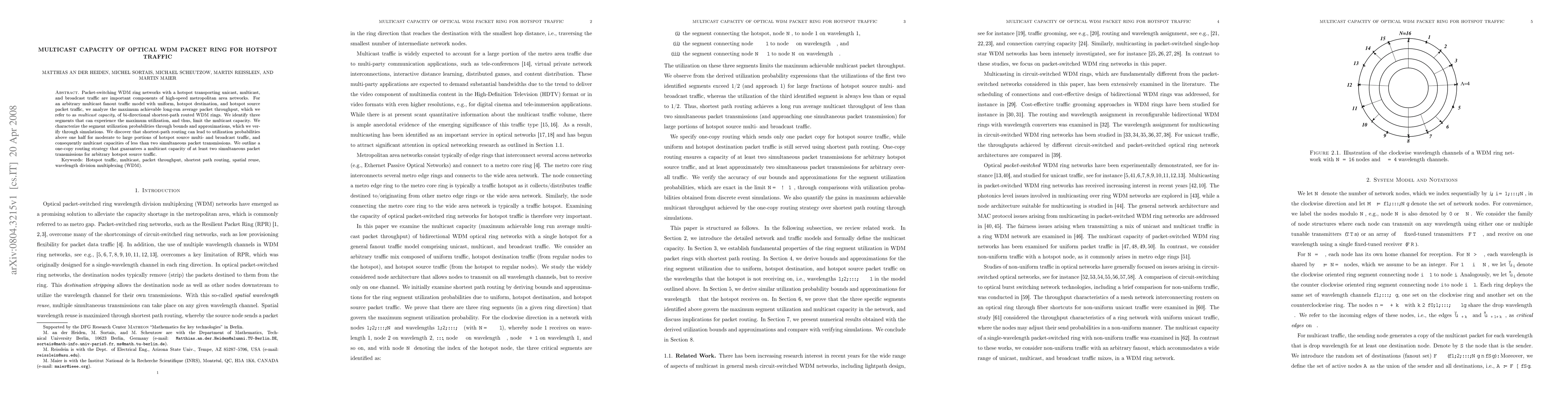 This paper analyzes the multicast capacity of optical WDM packet ring networks under hotspot traffic conditions, identifying segments that limit throughput and proposing a one-copy routing strategy to ensure at least two simultaneous packet transmissions. Simulation results show that shortest-path routing can lead to suboptimal multicast capacities.