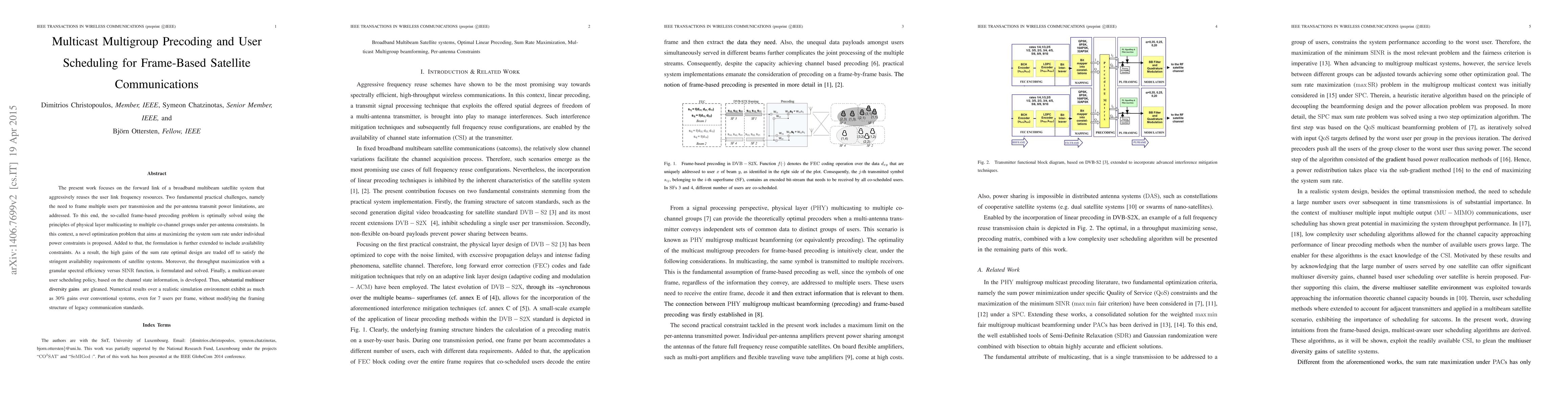 This paper proposes an optimal solution for frame-based precoding in multibeam satellite systems, addressing multicast multigroup precoding and user scheduling to maximize sum rate under power constraints. It also introduces a novel optimization problem to balance throughput maximization and availability requirements, achieving up to 30% performance gains over conventional systems.
