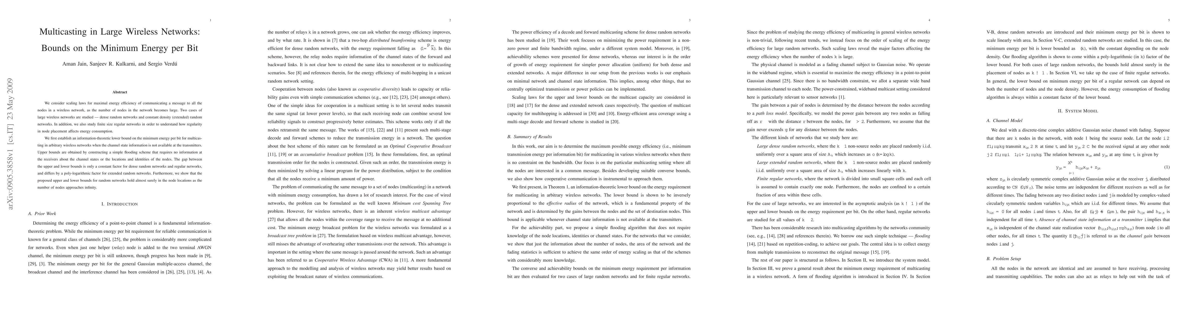 This paper establishes information-theoretic lower bounds and proposes upper bounds for the minimum energy per bit in multicasting across large wireless networks, with a focus on dense random, constant density random, and regular networks. The study finds that the gap between bounds is minimal for dense and regular networks but varies logarithmically for extended random networks.