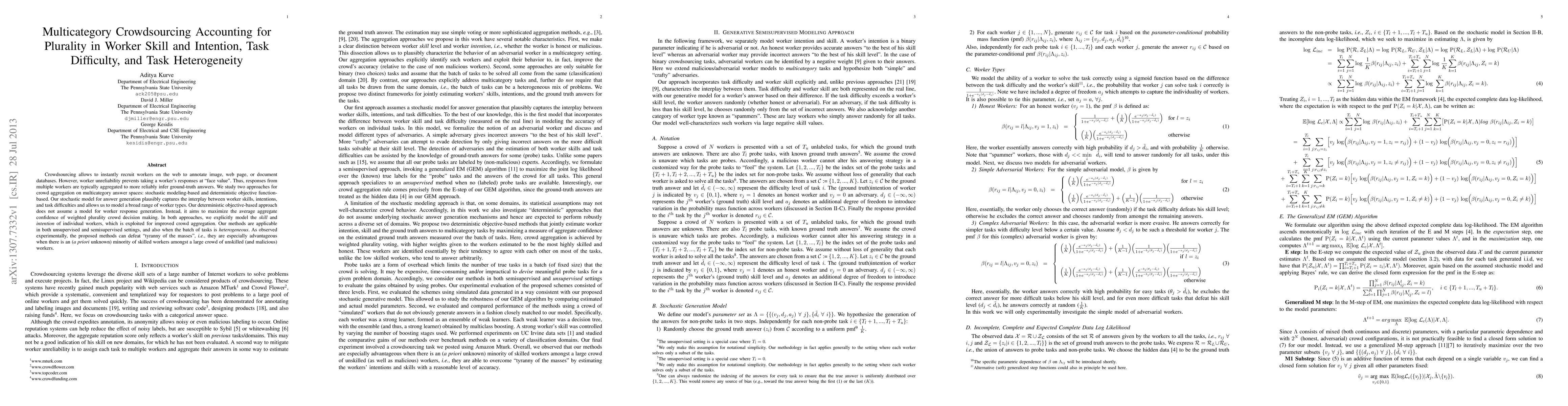 This paper proposes two crowd aggregation methods for multicategory crowdsourcing tasks, considering worker skill, intention, and task difficulty. The stochastic model captures the interplay between these factors, while the deterministic approach maximizes the average confidence of crowd decisions. Both methods outperform traditional aggregation in scenarios with a minority of skilled workers.