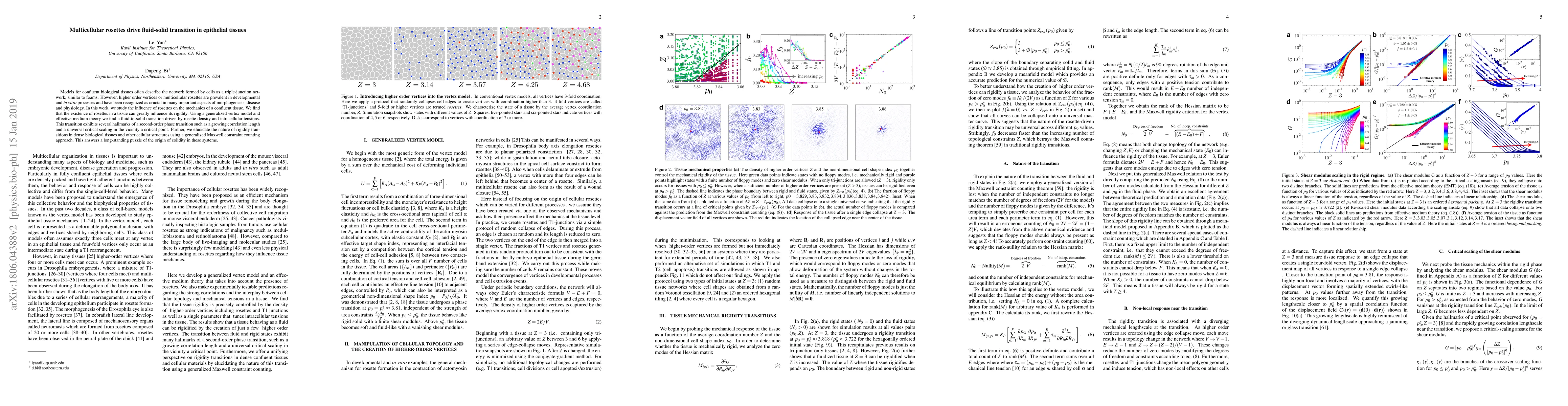 Models for confluent biological tissues often describe the network formed by cells as a triple-junction network, similar to foams. However, higher order vertices or multicellular rosettes are prevalent in developmental and {\it in vitro} processes and have been recognized as crucial in many important aspects of morphogenesis, disease, and physiology. In this work, we study the influence of rosettes on the mechanics of a confluent tissue. We find that the existence of rosettes in a tissue can greatly influence its rigidity. Using a generalized vertex model and effective medium theory we find a fluid-to-solid transition driven by rosette density and intracellular tensions. This transition exhibits several hallmarks of a second-order phase transition such as a growing correlation length and a universal critical scaling in the vicinity a critical point. Further, we elucidate the nature of rigidity transitions in dense biological tissues and other cellular structures using a generalized Maxwell constraint counting approach. This answers a long-standing puzzle of the origin of solidity in these systems.