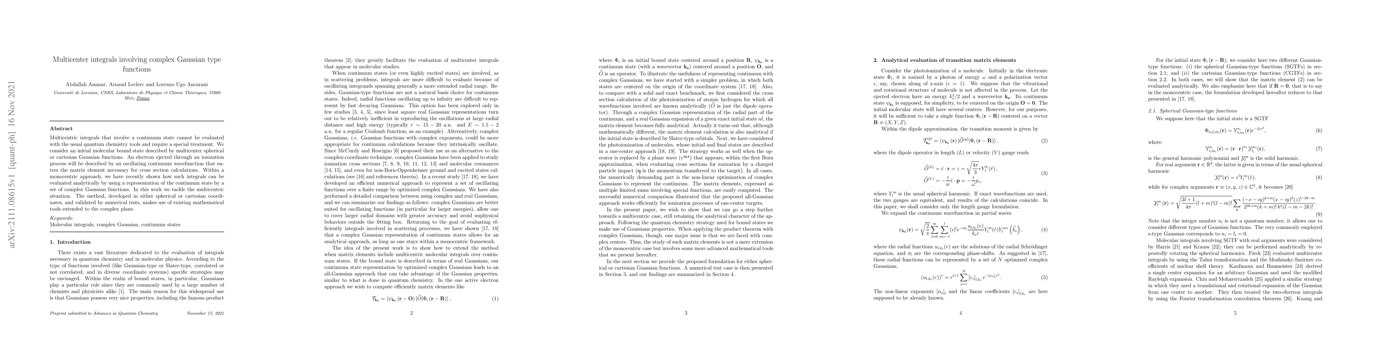 Multicentric integrals that involve a continuum state cannot be evaluated with the usual quantum chemistry tools and require a special treatment. We consider an initial molecular bound state described by multicenter spherical or cartesian Gaussian functions. An electron ejected through an ionization process will be described by an oscillating continuum wavefunction that enters the matrix element necessary for cross section calculations. Within a monocentric approach, we have recently shown how such integrals can be evaluated analytically by using a representation of the continuum state by a set of complex Gaussian functions. In this work we tackle the multicentric situation. The method, developed in either spherical or cartesian coordinates, and validated by numerical tests, makes use of existing mathematical tools extended to the complex plane.