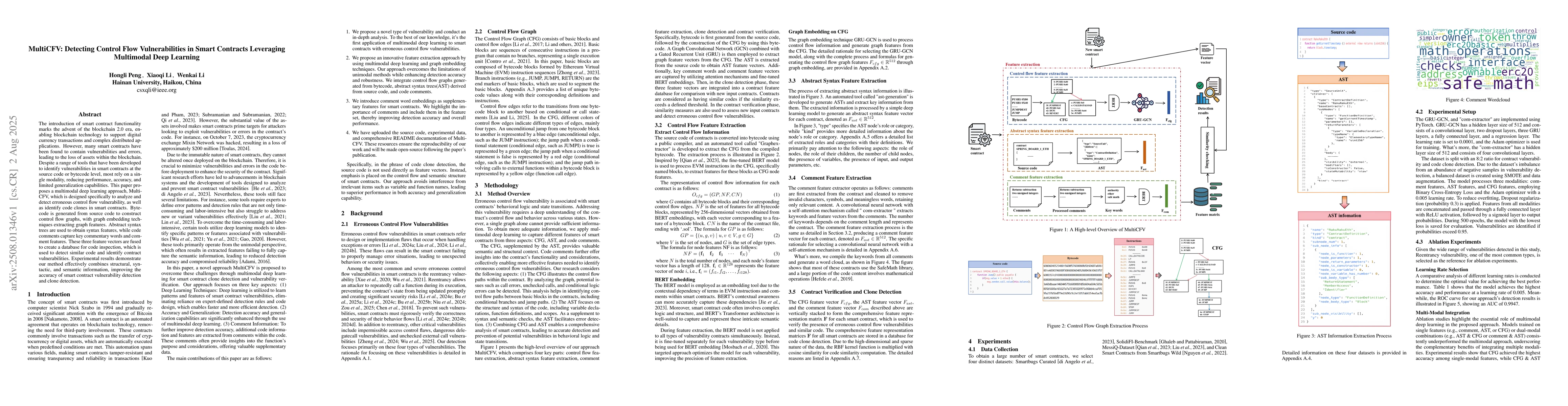 The introduction of smart contract functionality marks the advent of the blockchain 2.0 era, enabling blockchain technology to support digital currency transactions and complex distributed applications. However, many smart contracts have been found to contain vulnerabilities and errors, leading to the loss of assets within the blockchain. Despite a range of tools that have been developed to identify vulnerabilities in smart contracts at the source code or bytecode level, most rely on a single modality, reducing performance, accuracy, and limited generalization capabilities. This paper proposes a multimodal deep learning approach, MultiCFV, which is designed specifically to analyze and detect erroneous control flow vulnerability, as well as identify code clones in smart contracts. Bytecode is generated from source code to construct control flow graphs, with graph embedding techniques extracting graph features. Abstract syntax trees are used to obtain syntax features, while code comments capture key commentary words and comment features. These three feature vectors are fused to create a database for code inspection, which is used to detect similar code and identify contract vulnerabilities. Experimental results demonstrate our method effectively combines structural, syntactic, and semantic information, improving the accuracy of smart contract vulnerability detection and clone detection.