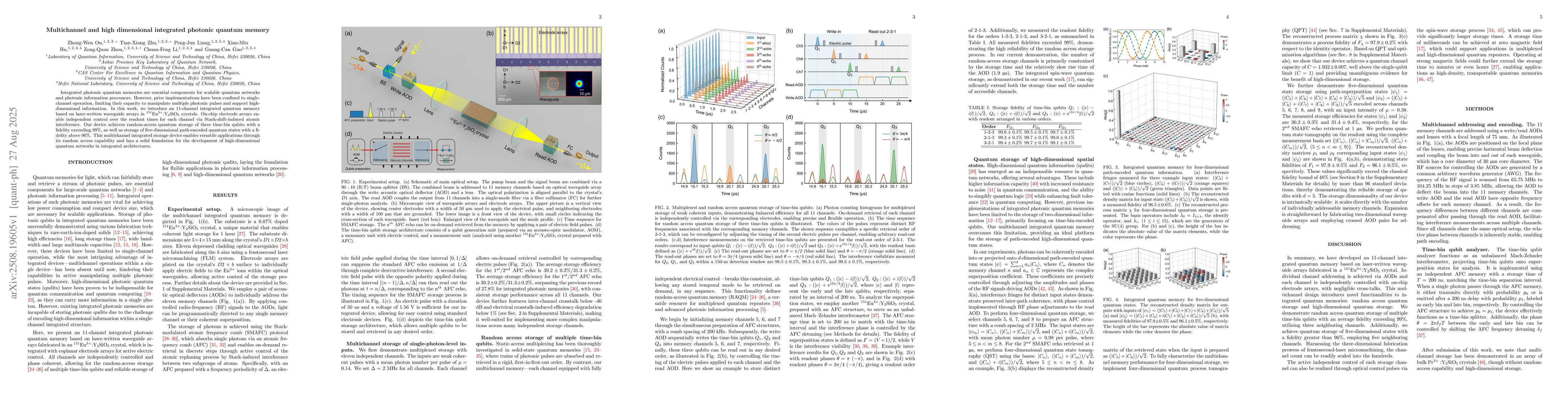 Integrated photonic quantum memories are essential components for scalable quantum networks and photonic information processors. However, prior implementations have been confined to single-channel operation, limiting their capacity to manipulate multiple photonic pulses and support high-dimensional information. In this work, we introduce an 11-channel integrated quantum memory based on laser-written waveguide arrays in $^{151}$Eu$^{3+}$:Y$_2$SiO$_5$ crystals. On-chip electrode arrays enable independent control over the readout times for each channel via Stark-shift-induced atomic interference. Our device achieves random-access quantum storage of three time-bin qubits with a fidelity exceeding 99%, as well as storage of five-dimensional path-encoded quantum states with a fidelity above 96%. This multichannel integrated storage device enables versatile applications through its random access capability and lays a solid foundation for the development of high-dimensional quantum networks in integrated architectures.