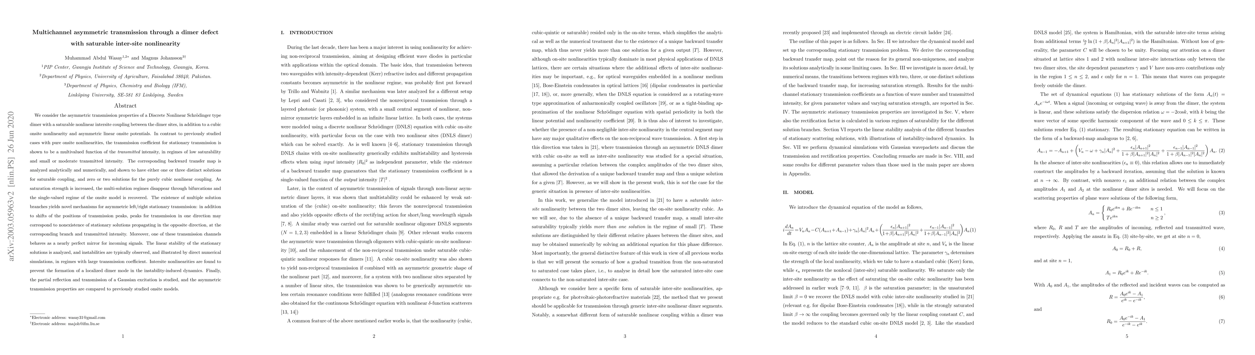 We consider the asymmetric transmission properties of a Discrete Nonlinear Schr{\"o}dinger type dimer with a saturable nonlinear intersite coupling between the dimer sites, in addition to a cubic onsite nonlinearity and asymmetric linear onsite potentials. In contrast to previously studied cases with pure onsite nonlinearities, the transmission coefficient for stationary transmission is shown to be a multivalued function of the transmitted intensity, in regimes of low saturability and small or moderate transmitted intensity. The corresponding backward transfer map is analyzed analytically and numerically, and shown to have either one or three distinct solutions for saturable coupling, and zero or two solutions for the purely cubic nonlinear coupling. As saturation strength is increased, the multi-solution regimes disappear through bifurcations and the single-valued regime of the onsite model is recovered. The existence of multiple solution branches yields novel mechanisms for asymmetric left/right stationary transmission: in addition to shifts of the positions of transmission peaks, peaks for transmission in one direction may correspond to nonexistence of stationary solutions propagating in the opposite direction, at the corresponding branch and transmitted intensity. Moreover, one of these transmission channels behaves as a nearly perfect mirror for incoming signals. The linear stability of the stationary solutions is analyzed, and instabilities are typically observed, and illustrated by direct numerical simulations, in regimes with large transmission coefficient. Intersite nonlinearities are found to prevent the formation of a localized dimer mode in the instability-induced dynamics. Finally, the partial reflection and transmission of a Gaussian excitation is studied, and the asymmetric transmission properties are compared to previously studied onsite models.