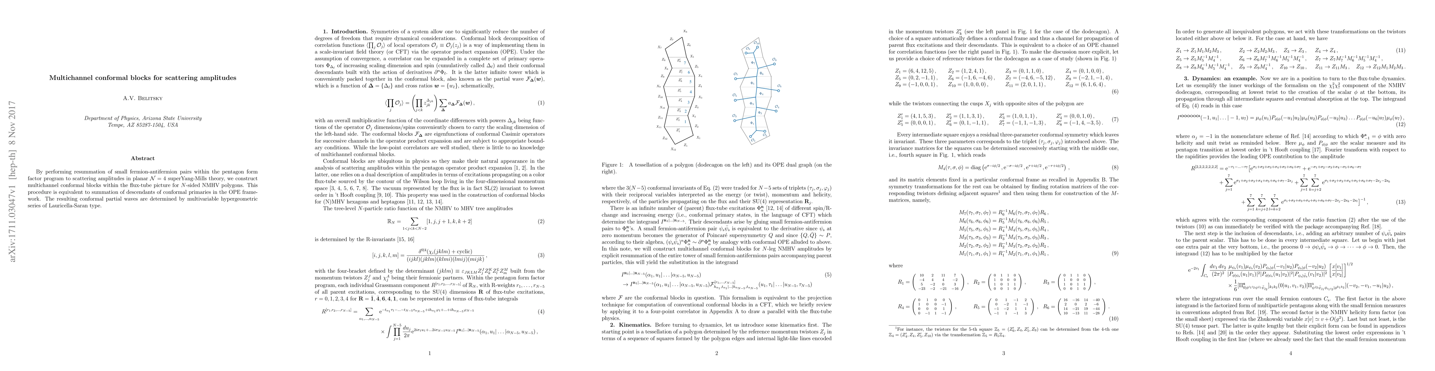 By performing resummation of small fermion-antifermion pairs within the pentagon form factor program to scattering amplitudes in planar N = 4 superYang-Mills theory, we construct multichannel conformal blocks within the flux-tube picture for N-sided NMHV polygons. This procedure is equivalent to summation of descendants of conformal primaries in the OPE framework. The resulting conformal partial waves are determined by multivariable hypergeometric series of Lauricella-Saran type.