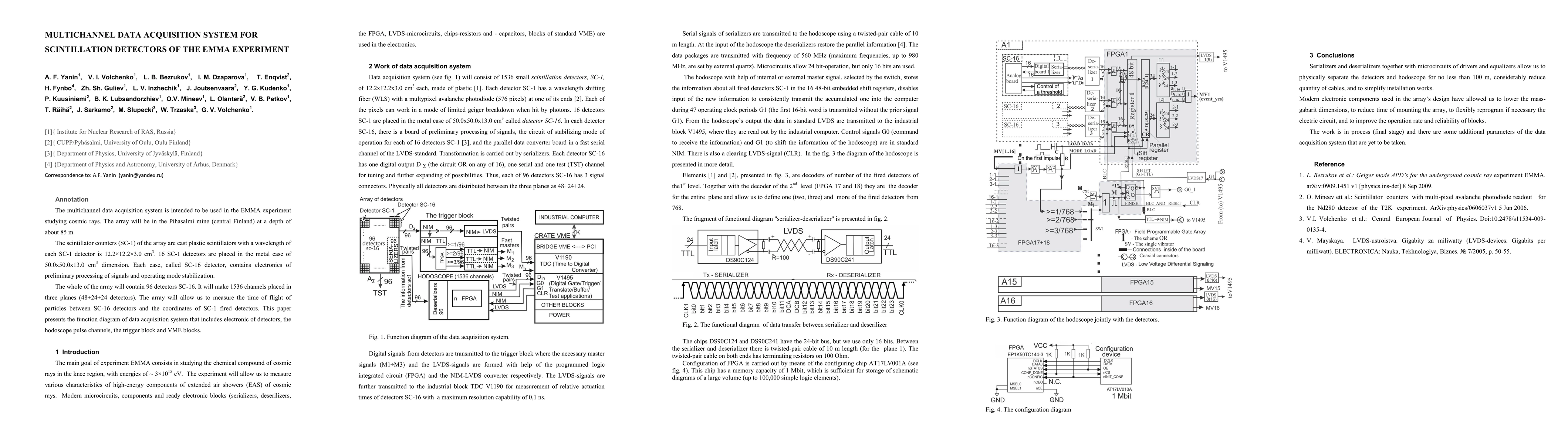 This paper describes a multichannel data acquisition system designed for the EMMA experiment's scintillation detectors, which will operate in the Pihasalmi mine in Finland. The system comprises 96 SC-16 detectors, each containing 16 plastic scintillators, and is intended to measure particle time of flight and coordinates.
