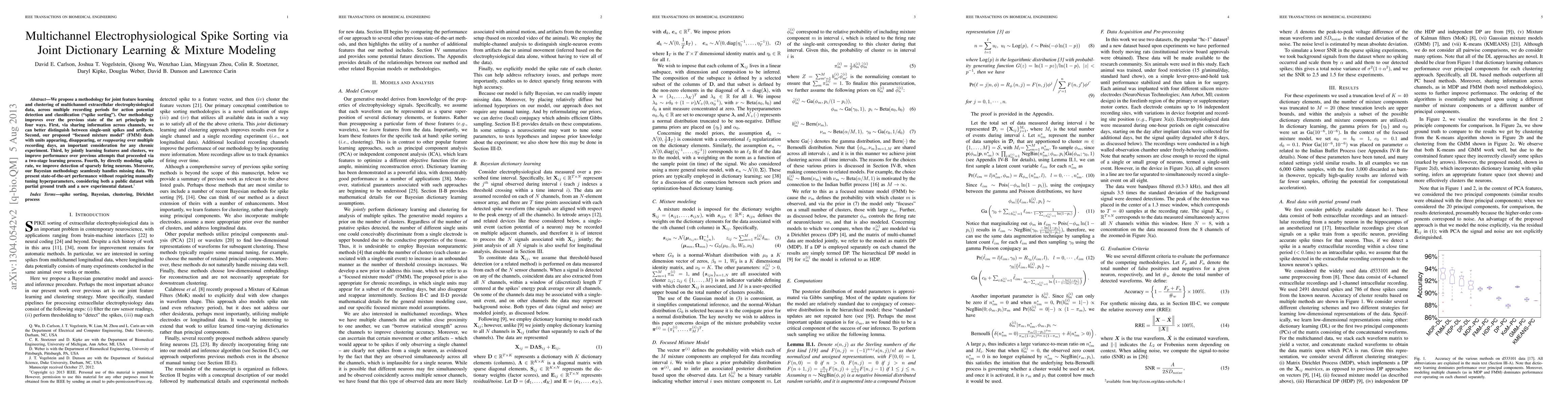 This paper introduces a novel method for spike sorting in multichannel extracellular electrophysiological data, combining joint dictionary learning and mixture modeling to enhance detection and discrimination of action potentials. The method improves spike sorting by sharing information across channels, handling dynamic neuron populations, and directly modeling spike rates, achieving state-of-the-art performance without extensive hyperparameter tuning.