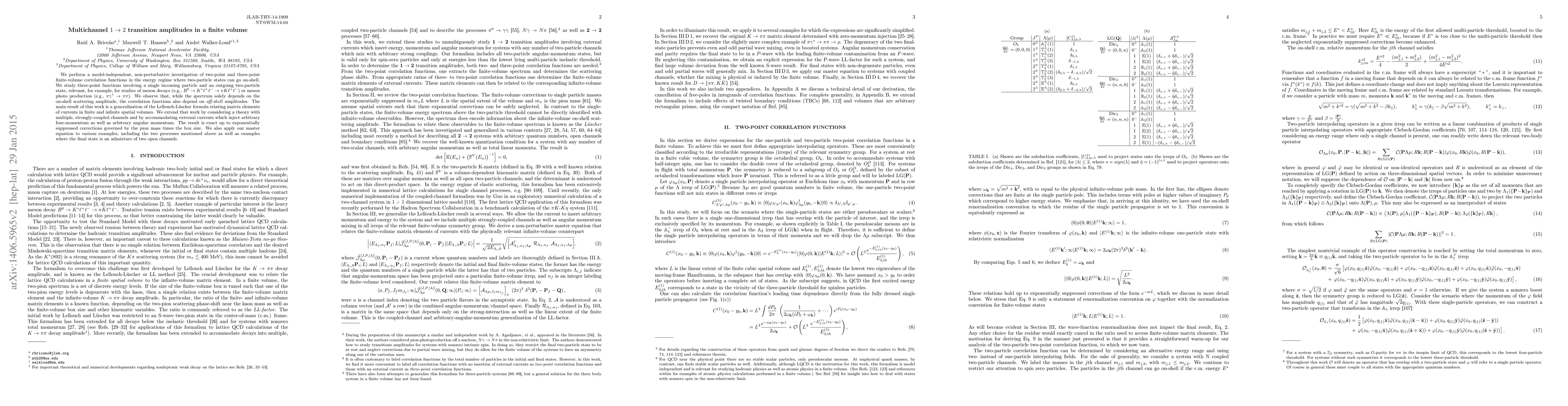 This paper investigates non-perturbative finite-volume correlation functions for two-particle states transitioning from one-to-two configurations, extending the Lellouch-Luscher formula to multiple channels and external currents. The study reveals that while the spectrum depends on on-shell scattering amplitudes, off-shell amplitudes also influence correlation functions, leading to a generalized formula valid up to exponentially small corrections.