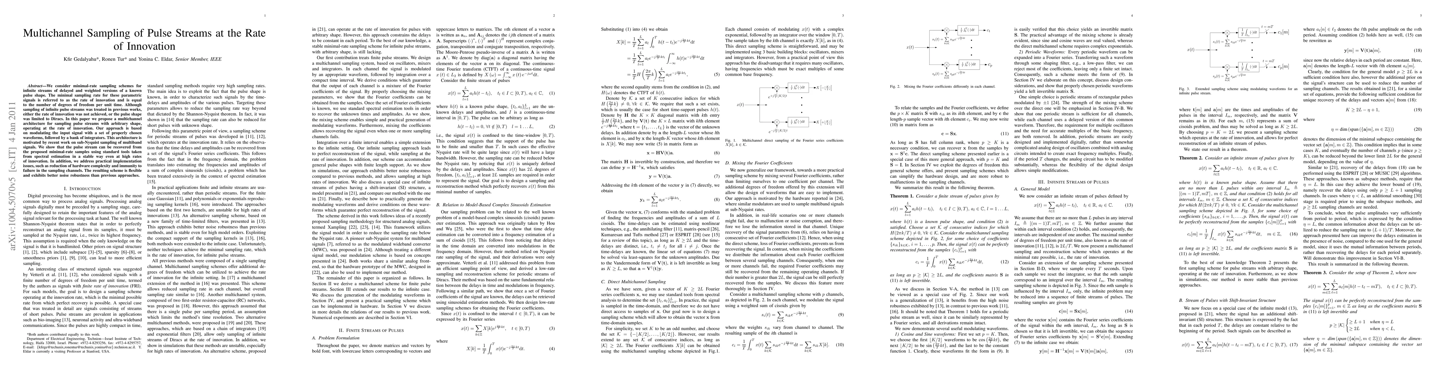 This paper proposes a multichannel architecture for sampling pulse streams at the minimal rate of innovation, achieving recovery of arbitrary pulse shapes through modulation and integration. It demonstrates stable recovery and improved noise robustness, addressing practical implementation challenges like hardware complexity and channel failure.