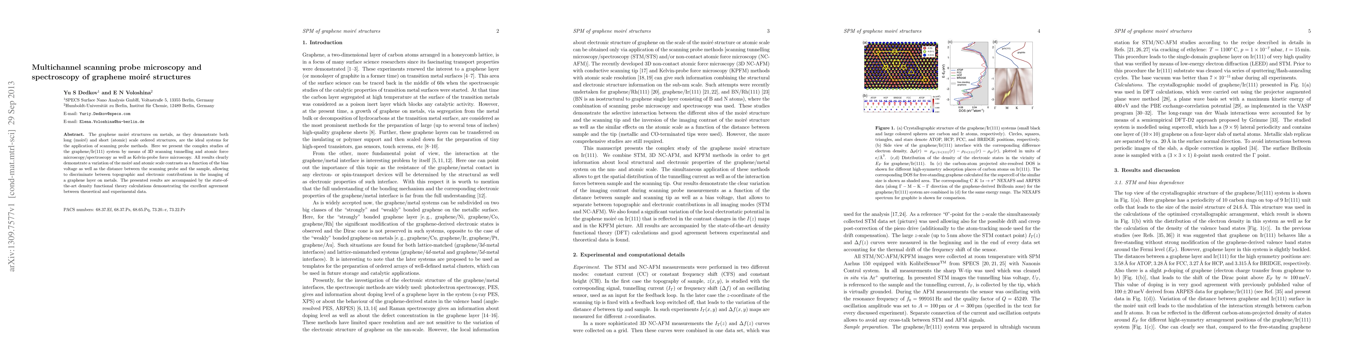 This research employs multichannel scanning probe microscopy and spectroscopy to study graphene moire structures on Ir(111) surfaces, revealing variations in moire and atomic scale contrasts influenced by bias voltage and probe-sample distance. The findings, supported by density functional theory calculations, enable discrimination between topographic and electronic imaging contributions.