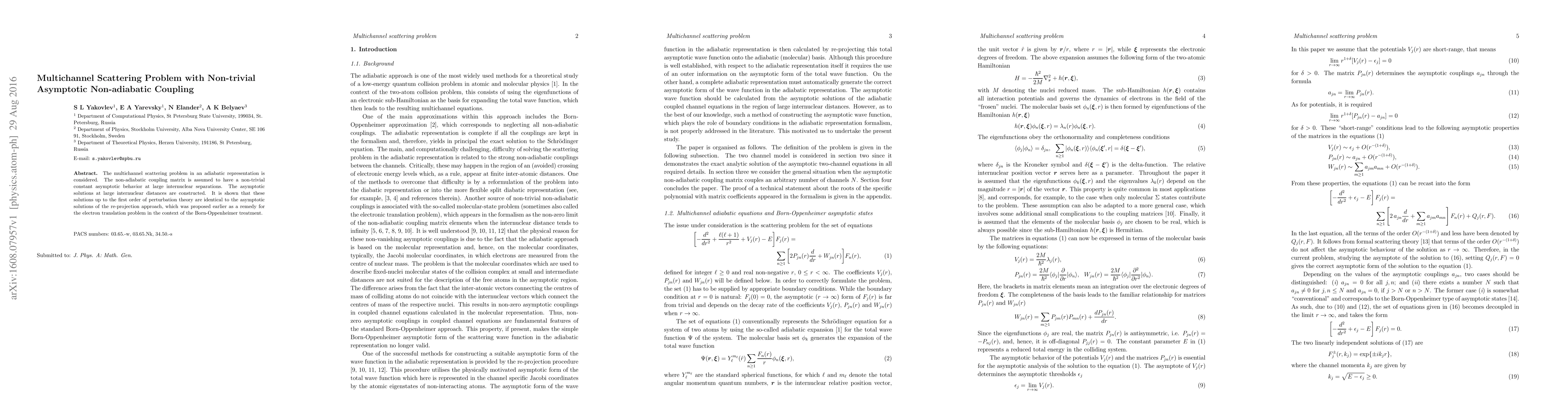 This paper investigates the multichannel scattering problem in an adiabatic framework, focusing on non-trivial asymptotic behavior of the non-adiabatic coupling matrix. It constructs asymptotic solutions at large internuclear distances and demonstrates their equivalence to solutions from the re-projection approach, previously used to address the electron translation problem in Born-Oppenheimer theory.