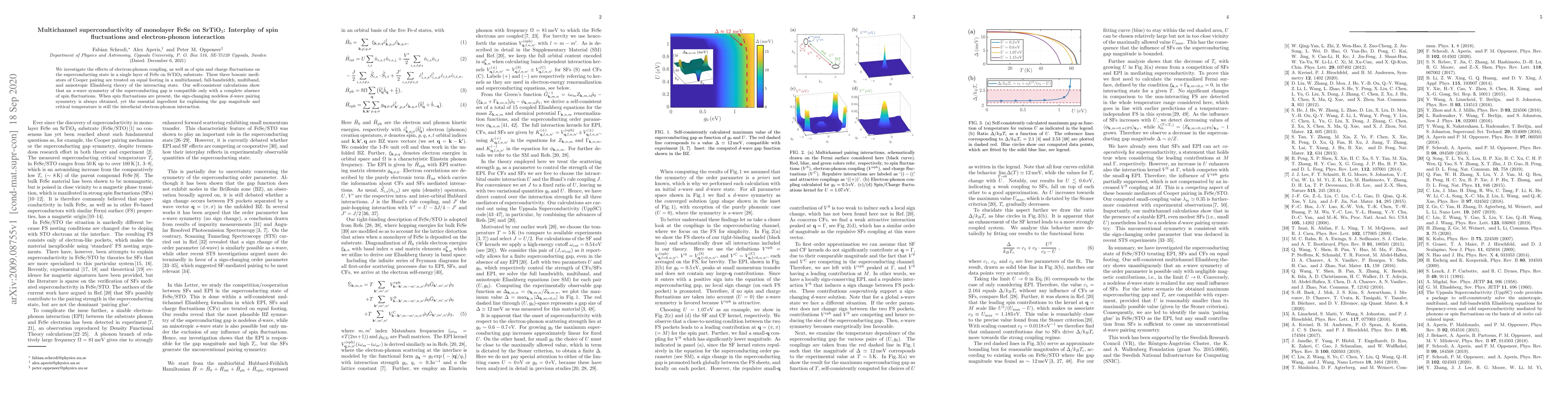 We investigate the effects of electron-phonon coupling, as well as of spin and charge fluctuations on the superconducting state in a single layer of FeSe on SrTiO$_3$ substrate. These three bosonic mediators of Cooper pairing are treated on equal footing in a multichannel, full-bandwidth, multiband, and anisotropic Eliashberg theory of the interacting state. Our self-consistent calculations show that an s-wave symmetry of the superconducting gap is compatible only with a complete absence of spin fluctuations. When spin fluctuations are present, the sign-changing nodeless d-wave pairing symmetry is always obtained, yet the essential ingredient for explaining the gap magnitude and critical temperature is still the interfacial electron-phonon interaction.