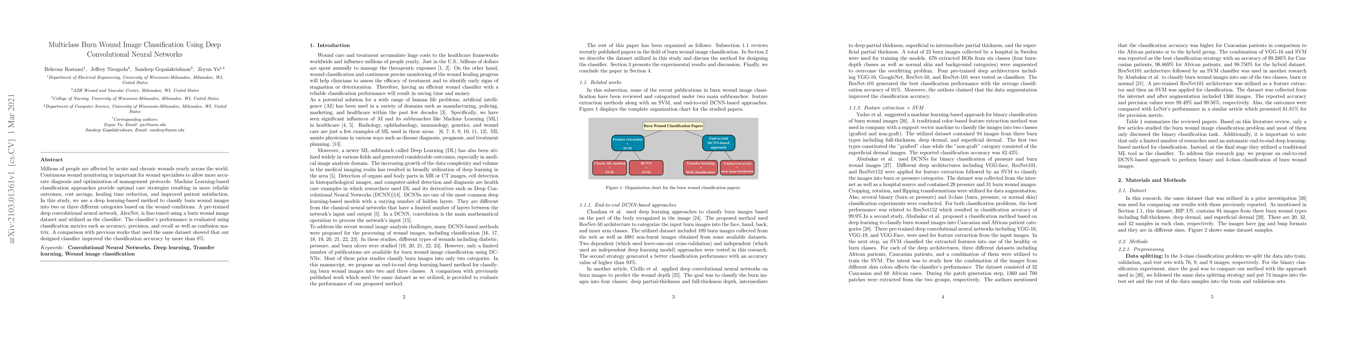 This study fine-tunes the AlexNet deep convolutional neural network to classify burn wound images into different condition categories, achieving an 8% improvement in accuracy over previous methods, demonstrating the potential of deep learning in wound management.
