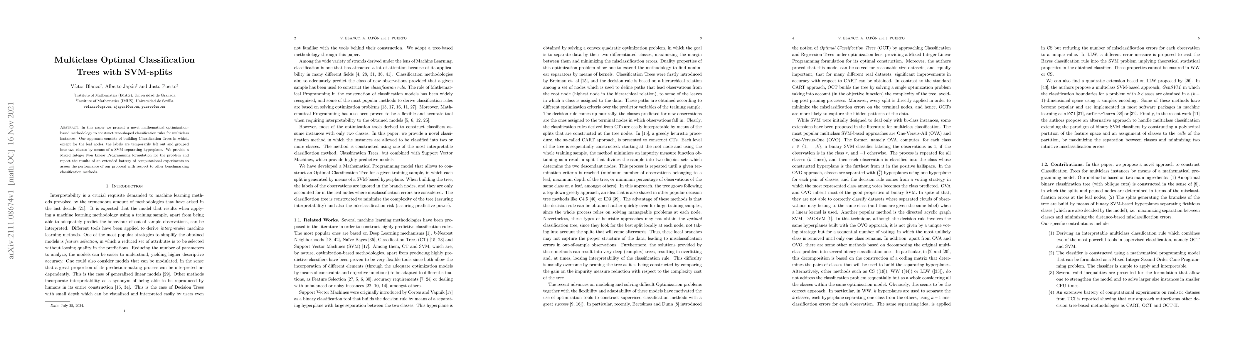 This paper introduces a new optimization-based method for constructing multiclass classification trees using SVM-splits, where internal nodes utilize SVM separating hyperplanes to group classes. The authors provide a Mixed Integer Non-Linear Programming formulation and evaluate their approach through extensive computational experiments.