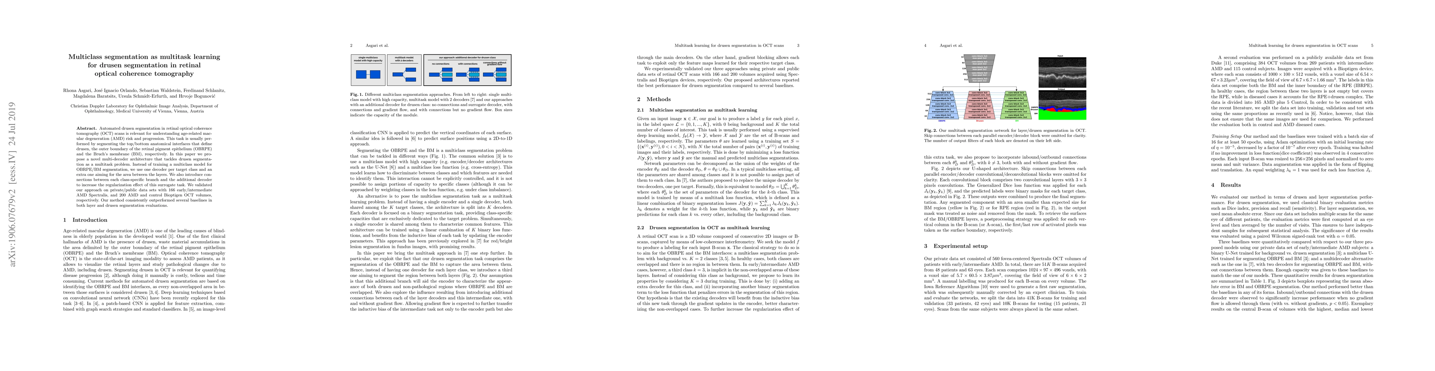 This paper proposes a multi-decoder architecture for automated drusen segmentation in retinal OCT scans, treating it as a multitask learning problem. The method outperforms baselines by segmenting the OBRPE and BM layers separately and using an extra decoder for the area between them, with connections enhancing regularization.
