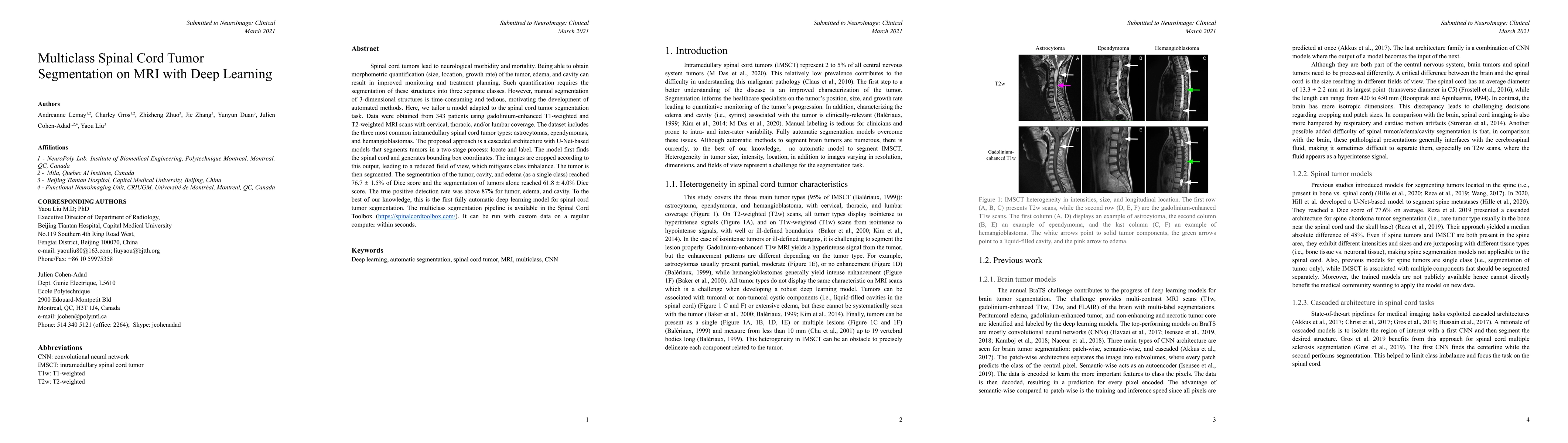 This paper presents a deep learning model for multiclass segmentation of spinal cord tumors, edema, and cavities on MRI scans, using a cascaded U-Net-based architecture. The model achieved a Dice score of 76.7% for combined segmentation and 61.8% for tumor alone, with an 87% true positive detection rate, marking the first fully automatic deep learning solution for this task.